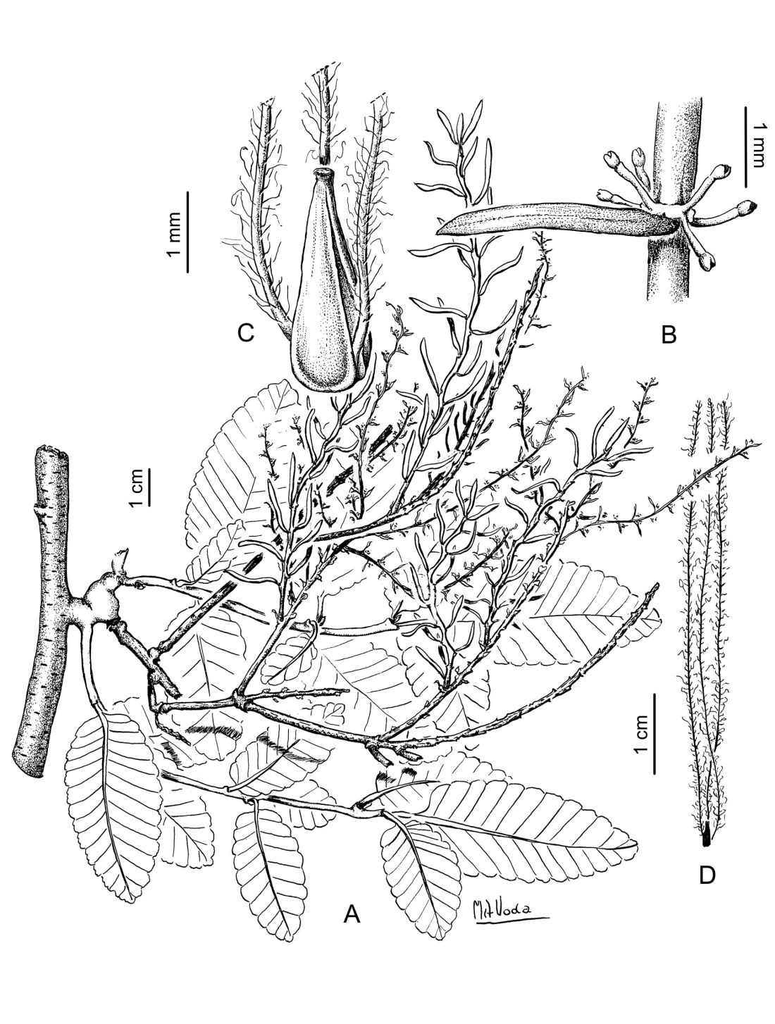 A. Planta. B. Porción de la Inflorescencia estaminada. C. Fruto. D. Fruto, silueta.