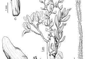 Planta de 30 cm de diámetro; haustorio con base engrosada; tallos lisos, con lenticelas dispersas, los jóvenes a menudo algo rojizos y pubescentes, los más viejos grisáceos, glabros. Hojas con láminas elípticas, de 15-30(-40) × 2-10 mm, base atenuada, ápice truncado, con 3-5 nervaduras marcadas, glabras o sólo con pubescencia en la vena media, verde lustrosas y rojizas en el ápice. Inflorescencia de 2-20 cm de largo; raquis pubescente; yemas de las inflorescencias naciendo por encima de las vegetativas. Inflorescencias elementales con brácteas foliáceas elípticas, ápice truncado de coloración rojiza, nervaduras evidentes, recaulescentes hasta la flor basal, flores en la base de la bráctea. Inflorescencia terminal ebracteada. Inflorescencia elemental estaminada de 2-10 mm de largo; brácteas de 7-10 × 3-6 mm, 6-10-floras; estambres, 3, filamentos breves verdes o castaños, anteras globosas, amarillas. Inflorescencia elemental pistilada hasta de 22 mm de largo, 8-20-flora, subsésil; brácteas de 10-23 × 3-13 mm, perianto verde o castaño violáceo; ovario globoso, terminado en un disco anular notorio que rodea al estilo corto, estigmas 3, verdes. Fruto ovoideo, de 2,5-3,3 × 0,7- 1,3 mm, glabro, castaño claro a rojizo, lustroso; setas maduras de 55-95 mm de largo, verde amarillentas o liláceas, plumosas en toda su longitud, ápice levemente incurvo, más oscuro.