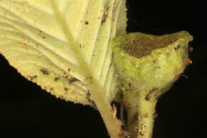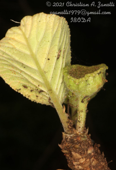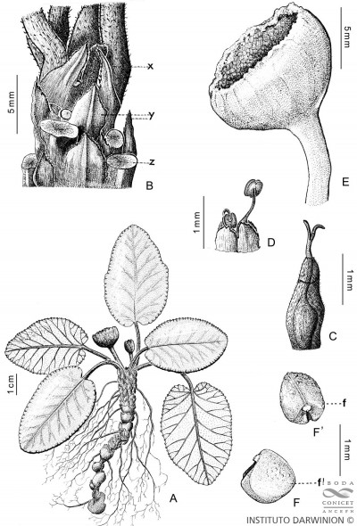 Hierbas perennes; tallo subterráneo de 2-10 cm de largo, tuberoso, con entrenudos cortos, pubérulo a glabrescente; látex blanco. Hojas con pecíolo de 2-9 cm de largo, robusto, verde-morado; lámina elíptica, ovada a ovado-oblonga, de 1,5-9 × 1-6 cm, base cordiforme (con un seno estrecho) u obtusa, ápice redondeado, emarginado, obtuso o agudo, con margen entero, ondulado o crenulado, cara adaxial áspera al tacto, cara abaxial pubescente o tomentosa, con 7-14 pares de nervios secundarios, cartáceas a coriáceas; estípulas deltoideas, de 1-7 mm de largo, con el nervio medio evidente, ciliadas. Inflorescencias en cenanto orbicular, de 0,5-3 cm de diámetro; margen entero o ligeramente crenado con 1-2 fi las de brácteas violáceas, cerca del margen, o con muchas filas más allá del margen; flores estaminadas entre las flores pistiladas; pedúnculo de 1-12 cm de largo, piloso. Flores estaminadas con perianto 2-4 lobulado; estambres 2, anteras subglobosas con el fi lamento delgado o incurvo. Flores pistiladas con estigmas desiguales, de 0,2-0,5 mm de largo. Fruto drupáceo, exocarpo dehiscente en dos valvas a la madurez, endocarpo subtetraédrico, de 1,2-1,5 mm de diámetro, con la superficie tuberculada. Semillas mayores de 1,2 mm de diámetro.
