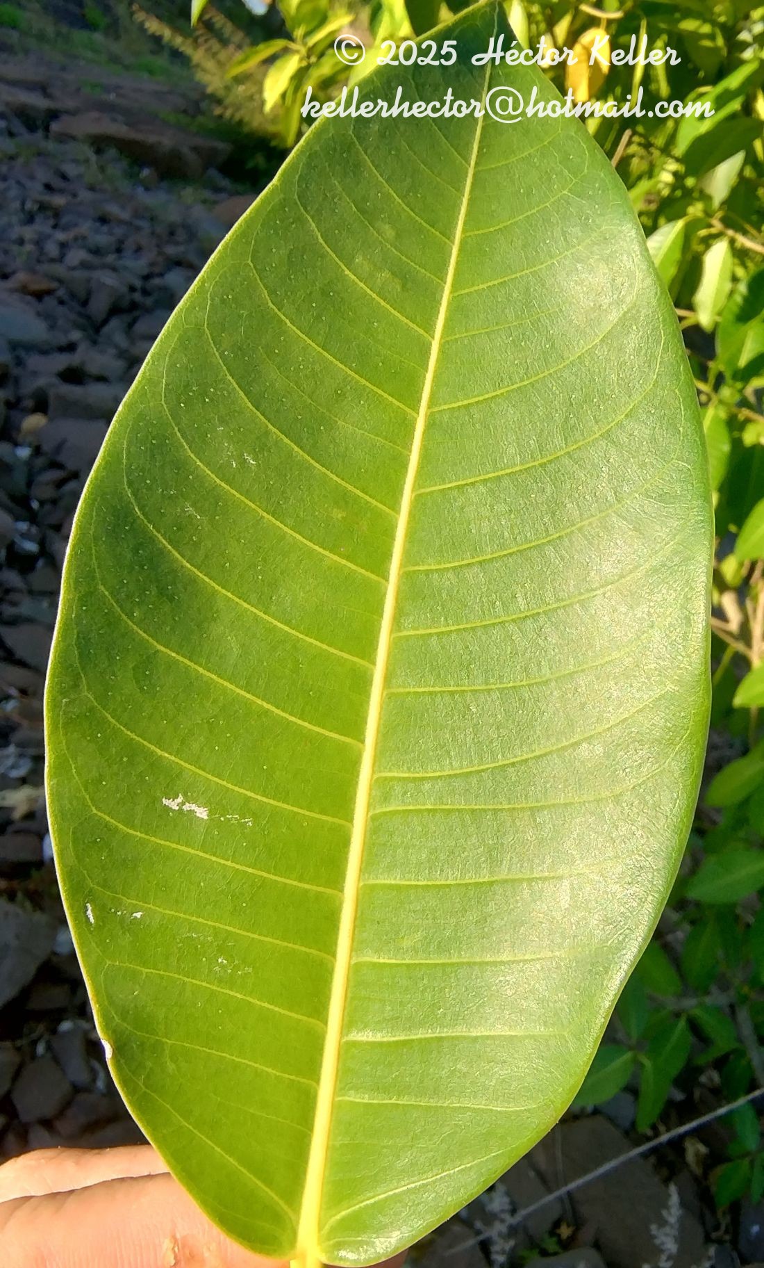 Árbol de 10-15 m de alto; ramitas con peridermis castaño-clara a castaño-rojiza. Hojas con pecíolos de 1-3,5 mm de largo, levemente canaliculados en la cara superior; lámina angostamente ovada a elíptica, de 5-16 × 2-6,5 cm, base cuneada, ápice acuminado, con dos glándulas en la axila de la vena secundaria basal, glabra; estípulas de 3-5 cm de largo, desiguales, castañas, glabras. Inflorescencia en siconos de 0,5-1 cm de largo (cuando secos), solitarios o geminados, axilares, levemente aplanados en la zona del ostíolo, verde-amarillentos, levemente pilosos; pedúnculos de 1-3 mm de largo, pilosos a glabrescentes; brácteas basales 3, triangulares, de 1-1,2 mm de largo.