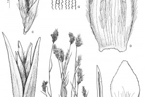 A. Planta. B. Espiguilla, vista lateral. C. Antecios. D. Lemma, vista dorsal. E. Pálea, vista dorsal. F. Pelo de la lemma, parte distal. G. Epidermis de la lemma mostrando un micropelo bicelular y un aguijón.