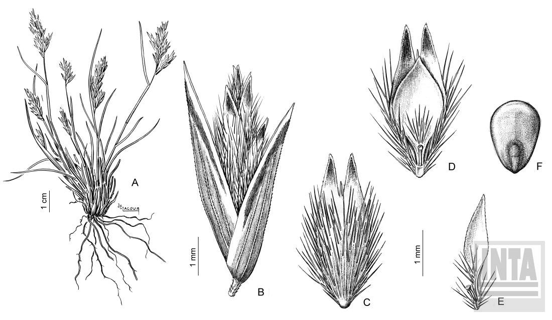 Plantas anuales, cespitosas de 6-18 cm de alto, con follaje principalmente basal; nudos glabros; vainas foliares pilosas en la parte superior; lígulas de 0,5-0,6 mm de largo, membranáceas en la base, ciliadas en la parte superior, rodeadas por pelos largos (hasta de 2,5 mm de largo) y rígidos; láminas setáceas de 1-5 cm de largo con abundantes pelos largos en su cara adaxial: Inflorescencias en panojas exertas, contraídas de 1-4 cm de largo. Espiguillas pediceladas, 4-7-floras, verdosas o rojizas de 6-7 mm de largo; artejos de la raquilla glabros; glumas de (3-)5-7 mm de largo, con los nervios escabrosos; lemma de 2,5-3,5 mm de largo, borde y dorso piloso en su ½ inferior, ápice agudo, profundamente hendido, con un mucrón o arístula diminuta entre ellos; pálea unguiculada, pilosa entre las carinas; callo piloso en sus costados; anteras de 0,2-0,3 mm de largo; cariopsis traslúcida menor de 1 mm de largo, hilo elíptico subbasal.