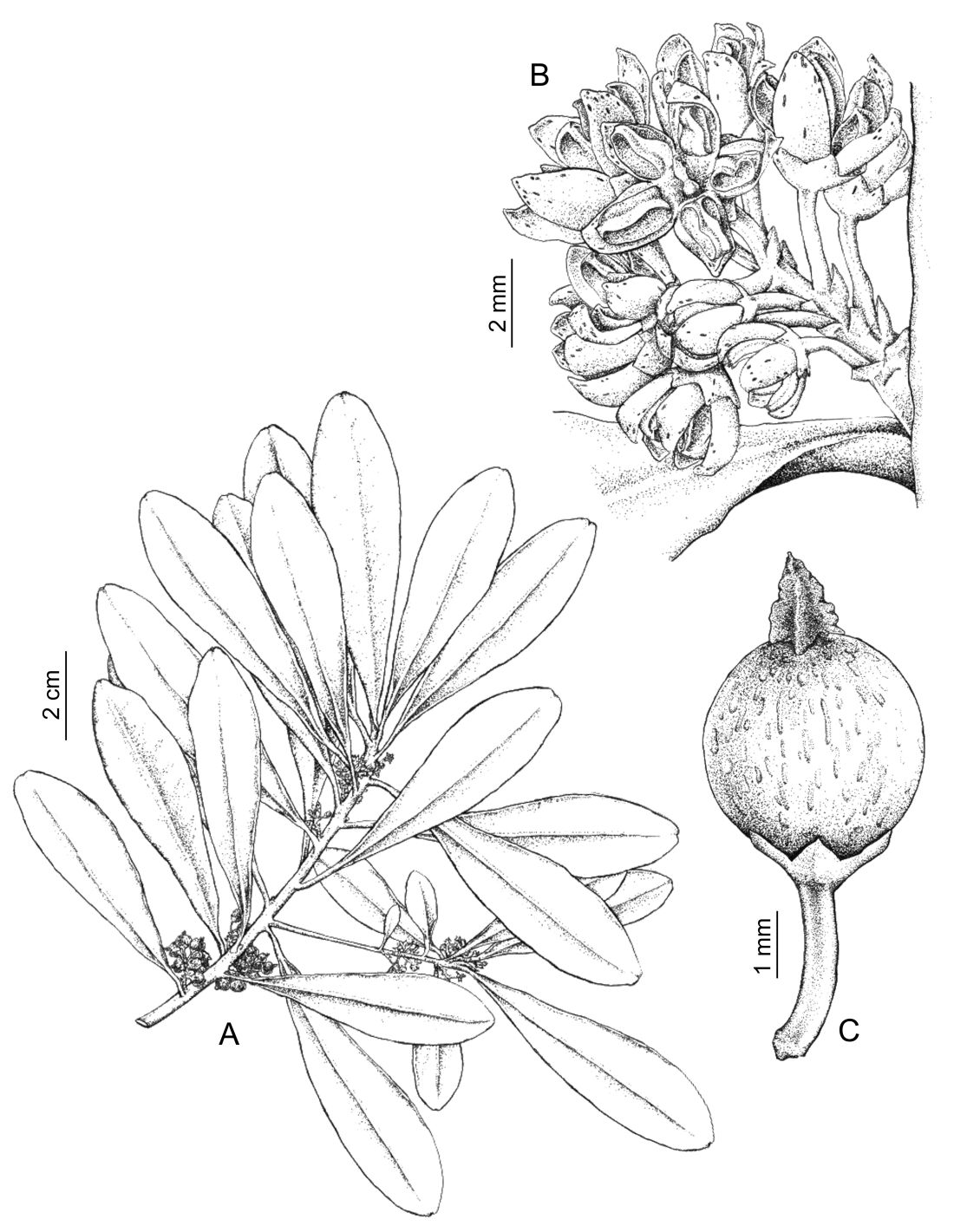 Porción de rama florífera. B. Detalle de inflorescencia. C. Fruto.