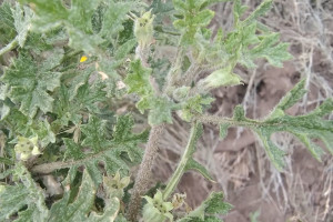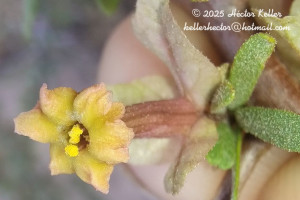 Arbusto de 1-3 m de alto; espinas de 10-30 × 2 mm, bifurcadas (raro simples). Hojas en fascículos sobre braquiblastos; pecíolo de 0,5 mm de largo; lámina angostamente espatulada, de 0,5-35 × 3 mm, ápice redondeado. Inflorescencia uniflora; pedúnculo de 0,5 mm de largo, no ramificado, surgiendo en la axila de una espina o de un braquiblasto. Flor solitaria con tres brácteas, no recaulescentes, ovado-cordadas, de 1-20 × 1-20 mm, glabras, blanco-amarillentas a rosado-liláceas, membranáceas; perigonio hipocrateriforme, de 15 mm de largo, castaño claro, 5-nervado; tépalo con lóbulo central agudo, no glanduloso, lóbulos comisurales no hendidos, redondeados, no glandulosos; estambres 5-8; ovario ovoide, de 4 × 2 mm; estigma sésil, de 1 mm de largo.