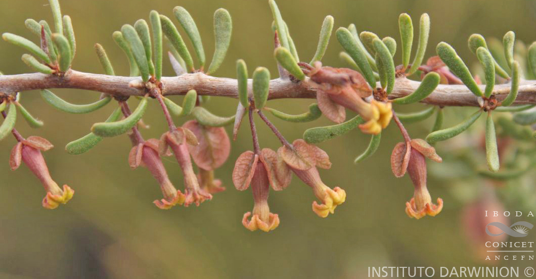 Arbusto de 1-3 m de alto; espinas de 10-30 × 2 mm, bifurcadas (raro simples). Hojas en fascículos sobre braquiblastos; pecíolo de 0,5 mm de largo; lámina angostamente espatulada, de 0,5-35 × 3 mm, ápice redondeado. Inflorescencia uniflora; pedúnculo de 0,5 mm de largo, no ramificado, surgiendo en la axila de una espina o de un braquiblasto. Flor solitaria con tres brácteas, no recaulescentes, ovado-cordadas, de 1-20 × 1-20 mm, glabras, blanco-amarillentas a rosado-liláceas, membranáceas; perigonio hipocrateriforme, de 15 mm de largo, castaño claro, 5-nervado; tépalo con lóbulo central agudo, no glanduloso, lóbulos comisurales no hendidos, redondeados, no glandulosos; estambres 5-8; ovario ovoide, de 4 × 2 mm; estigma sésil, de 1 mm de largo.