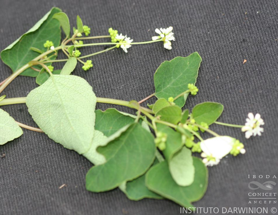 Hierba perenne apoyante de 0,6-2,5 m de alto. Hojas opuestas, oval-oblongas, de 37-100 × 30-75 mm, anisófilas, glabras, discolores, enteras, papiráceas, base atenuada; rafidios sólo en el hipófilo. Inflorescencias 8-16-floras; brácteas caducas, hipófilo blanco. Flores blancas, de 1,3-3 mm; perigonio campanulado, limbo 5-partido; tépalo uninervado; estambres 5; ovario de contorno oblongo, atenuado en el ápice; estilo filiforme; estigma fimbriado. Antocarpo turbinado, de 1,8-3 × 2 mm, atenuado en los extremos, 5-costado. Utrículo globoso, atenuado en el ápice.