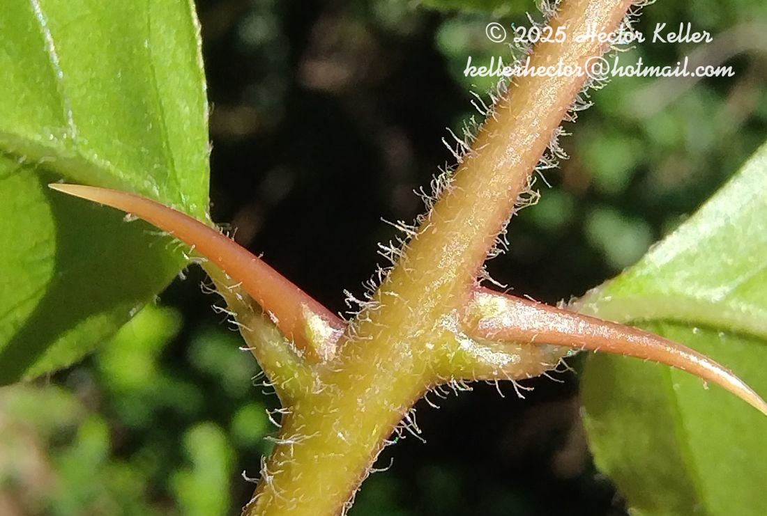 Observaciones: Nombres vulgares y usos. “Cagalero”, “espino-negro”, “espora-de-galo”; “garabato-prieto”, “tapaciriba”, “uña de gato”, “uña del diablo”, “yagua-pinda” (Furlan & Giulietti, 2014). La corteza se utiliza como medicinal. La presencia de espinas es exclusiva de esta especie y facilita su identificación. En la Argentina crece Pisonia aculeata var. aculeata, que se diferencia de la var. macranthocarpa Donn. Sm., propia de México, Guatemala, Costa Rica, Venezuela y las Antillas, por ser una planta trepadora, con espinas curvas en los nudos y tener un antocarpo de menor ancho. Sus flores son visitadas por dípteros y pequeños himenópteros por lo que podría ser una especie entomófila; las infrutescencias se adhieren al pelaje de los animales a través de las glándulas del antocarpo (Chodat & Rehfous, 1926).