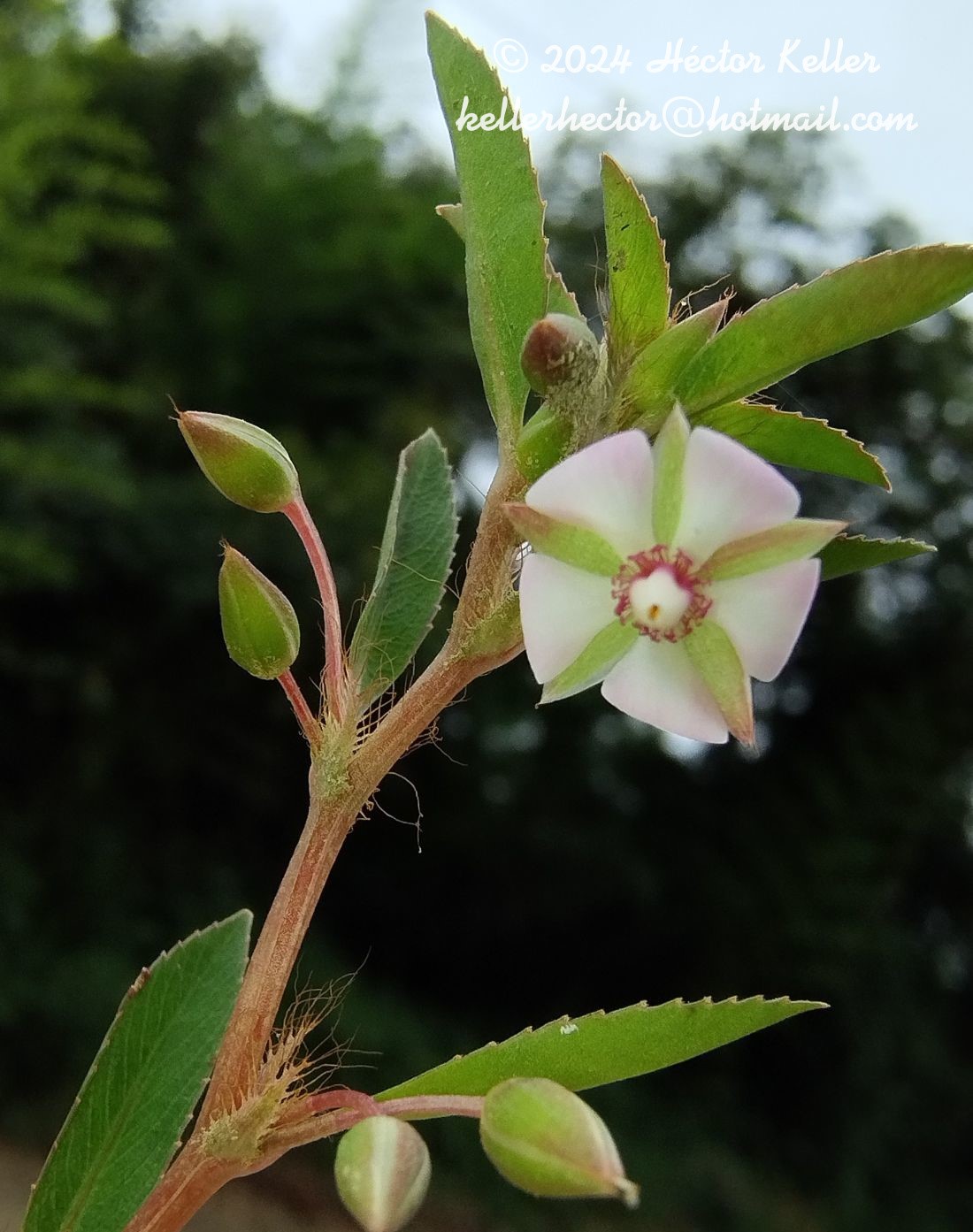Sufrútices de (7-)10-30 cm de alto; tallos erectos, glabros. Hojas cortamente pecioladas, glabras, ovado-lanceoladas, de 1-2 × 0,3-0,5 cm, base decurrente, ápice agudo, margen dentado con una glándula en cada diente, el limbo prolongado mas allá de la nervadura marginal en un ala angosta; estípulas de 0,6-0,9 cm de largo. Flores solitarias o raramente en grupos de 2-3 en la parte superior del tallo, axilares, de 0,9-11 mm de diámetro; pedicelos de 1-1,5 cm de largo; sépalos 5, lanceolados, de 3-6 × 1-2 mm, papiráceos, membranáceos en el borde, margen liso o con pocos dientes cortos y algunas lacinias en la base, de aspecto semejante a las de las estípulas, ápice con 2-3 arístulas; pétalos 5, obovados, de 3,5-5 × 1,5-3,2 mm, base cuneada, ápice redondeado, margen entero, blanco-amarillentos, glabros; androceo formado por 3 ciclos: el exterior constituido por numerosos estaminodios de 1-2 mm de largo, con el ápice reniforme; el ciclo medio constituido por 5 estaminodios, angostamente elípticos, de 2,8-3 × 1 mm, erectos; el ciclo interno con 5 estambres fértiles, anteras basifijas, lineares, de 1,5-2,5 mm de largo, con los filamentos muy cortos y gruesos; ovario ovoide; estilo de 1,2-3 mm de largo. Cápsulas ovoides, de 4-6 × 3-7 mm, multiseminadas, el estilo persistente o no. Semillas elipsoides, de 0,6-0,7 × 0,2-0,5 mm.