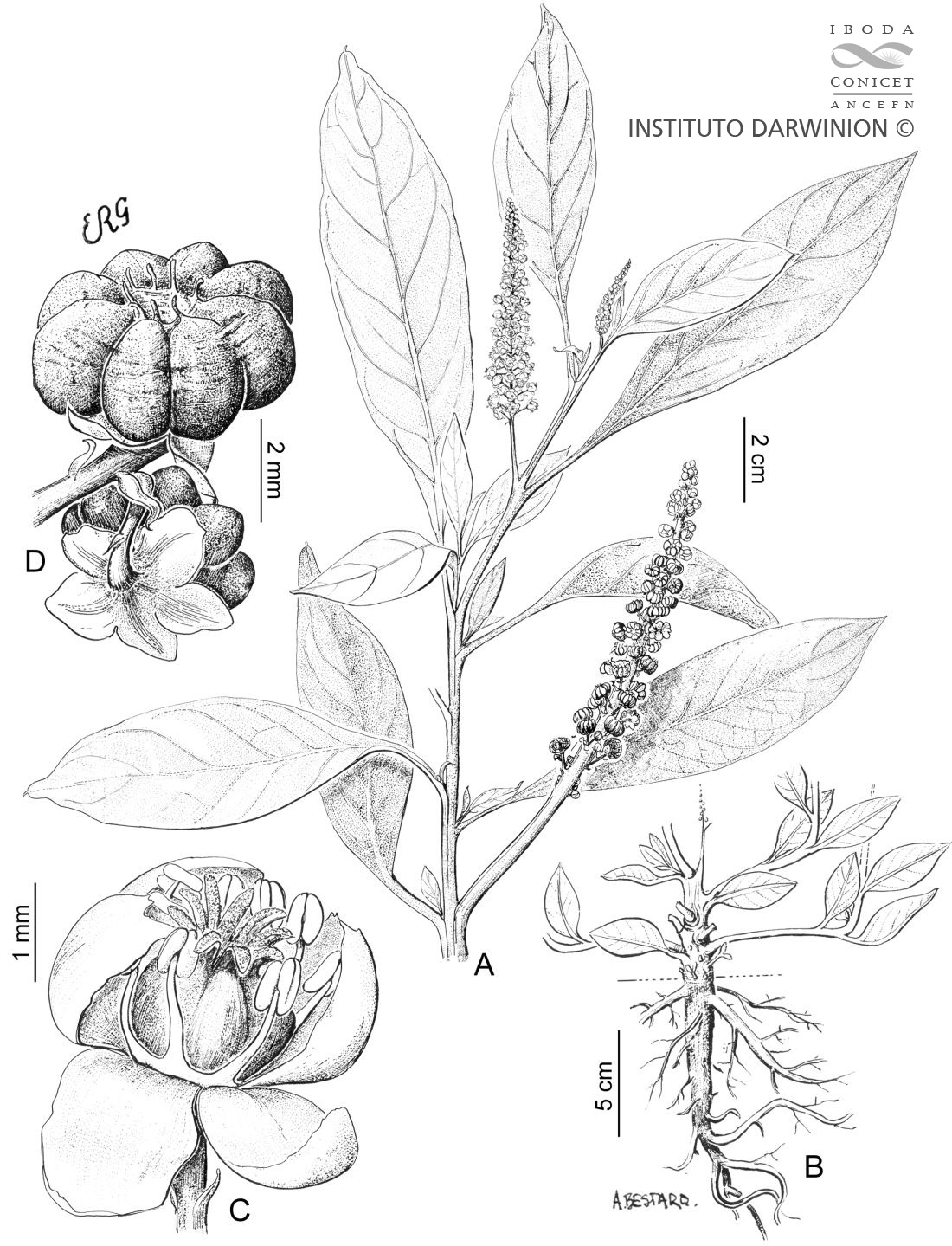 A. Planta, porción de rama florífera y fructífera. B. Planta, porción basal. C. Flor. D. Fruto.