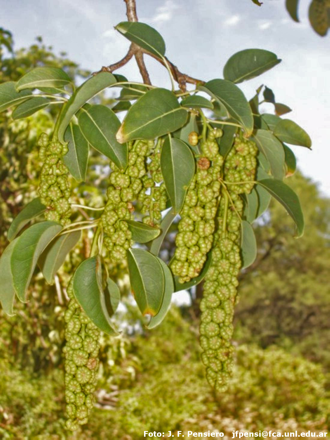 Árboles dioicos de 4-40 m de alto, con crecimiento secundario anómalo, ramas glabras o pubescentes, raíces tabulares que se extienden radialmente con una circunferencia de 12-30 m. Hojas con pecíolos de 1,5-7 cm de largo, surcados, papilosos o pubescentes; láminas elípticas u ovadas, de 2-15 × 1,5-8,5 cm, ápice obtuso, agudo a acuminado, de base redondeada a levemente asimétrica, a veces decurrentes, de margen entero a levemente ondulado y circundado por una fina línea amarilla, cartáceas a coriáceas, glabras o pubérulas a lo largo del nervio medio prominente en la cara abaxial; estípulas triangulares, de 4,5-5 × ca. 1 mm. Inflorescencias en racimos de 6,5-20 cm de largo, axilares o terminales, péndulas, las estaminadas caducas y las pistiladas se desprenden con la totalidad de los frutos a la madurez; eje principal papiloso o pubescente. Flores estaminadas con pedicelos de 2,5-8 mm de largo; bráctea triangular de 0,5-1,5 × 0,5 mm, papiráceas; bractéolas 2, escuamiformes, elípticas o lanceoladas, de 0,5-2 × 0,5-1 mm, de ápice obtuso o acuminado; tépalos 5, de 2-4 × 1-2 mm, cóncavos, enteros a algo fimbriados; estambres 20-30, en dos verticilos irregulares, filamentos de 4-5 mm de largo, insertos por debajo del disco hipógino nectarífero, anteras lineares, de 1,5-2 mm de largo; ovario ocasionalmente presente, con 2-4 carpelos abortivos; flores pistiladas con pedicelos ca. 2-5 mm de largo; bráctea ca. 0,5 mm de largo; bractéolas 2, ca. 0,5 mm de largo; tépalos 5, elípticos, de 2,5-4 × 2-3 mm, más o menos iguales entre sí, cóncavos, enteros a algo fimbriados; estambres ca. 10, rudimentarios, disco hipógino nectarífero; ovario globoso, de 2,4-4 mm de diámetro, con 8-12 carpelos, connados en la base y libres entre sí en el ápice, estilos no conniventes. Fruto una baya subcilíndrica, de 0,5-1,3 × 0,3-1,2 cm, aplanada longitudinalmente, verdoso-amarillenta, con los tépalos persistentes. Semillas 8-10, de 3-4 mm de diámetro, comprimidas, con la testa negra, brillante y levemente reticulada.