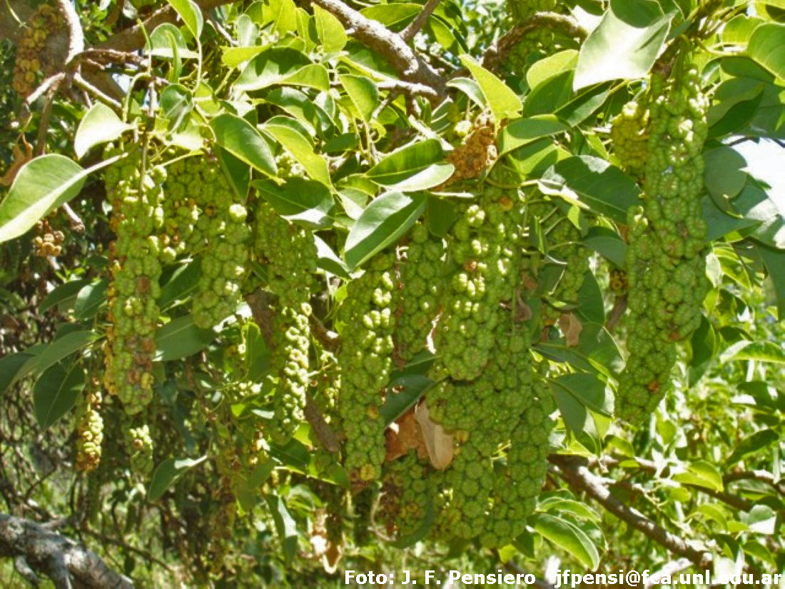 Árboles dioicos de 4-40 m de alto, con crecimiento secundario anómalo, ramas glabras o pubescentes, raíces tabulares que se extienden radialmente con una circunferencia de 12-30 m. Hojas con pecíolos de 1,5-7 cm de largo, surcados, papilosos o pubescentes; láminas elípticas u ovadas, de 2-15 × 1,5-8,5 cm, ápice obtuso, agudo a acuminado, de base redondeada a levemente asimétrica, a veces decurrentes, de margen entero a levemente ondulado y circundado por una fina línea amarilla, cartáceas a coriáceas, glabras o pubérulas a lo largo del nervio medio prominente en la cara abaxial; estípulas triangulares, de 4,5-5 × ca. 1 mm. Inflorescencias en racimos de 6,5-20 cm de largo, axilares o terminales, péndulas, las estaminadas caducas y las pistiladas se desprenden con la totalidad de los frutos a la madurez; eje principal papiloso o pubescente. Flores estaminadas con pedicelos de 2,5-8 mm de largo; bráctea triangular de 0,5-1,5 × 0,5 mm, papiráceas; bractéolas 2, escuamiformes, elípticas o lanceoladas, de 0,5-2 × 0,5-1 mm, de ápice obtuso o acuminado; tépalos 5, de 2-4 × 1-2 mm, cóncavos, enteros a algo fimbriados; estambres 20-30, en dos verticilos irregulares, filamentos de 4-5 mm de largo, insertos por debajo del disco hipógino nectarífero, anteras lineares, de 1,5-2 mm de largo; ovario ocasionalmente presente, con 2-4 carpelos abortivos; flores pistiladas con pedicelos ca. 2-5 mm de largo; bráctea ca. 0,5 mm de largo; bractéolas 2, ca. 0,5 mm de largo; tépalos 5, elípticos, de 2,5-4 × 2-3 mm, más o menos iguales entre sí, cóncavos, enteros a algo fimbriados; estambres ca. 10, rudimentarios, disco hipógino nectarífero; ovario globoso, de 2,4-4 mm de diámetro, con 8-12 carpelos, connados en la base y libres entre sí en el ápice, estilos no conniventes. Fruto una baya subcilíndrica, de 0,5-1,3 × 0,3-1,2 cm, aplanada longitudinalmente, verdoso-amarillenta, con los tépalos persistentes. Semillas 8-10, de 3-4 mm de diámetro, comprimidas, con la testa negra, brillante y levemente reticulada.