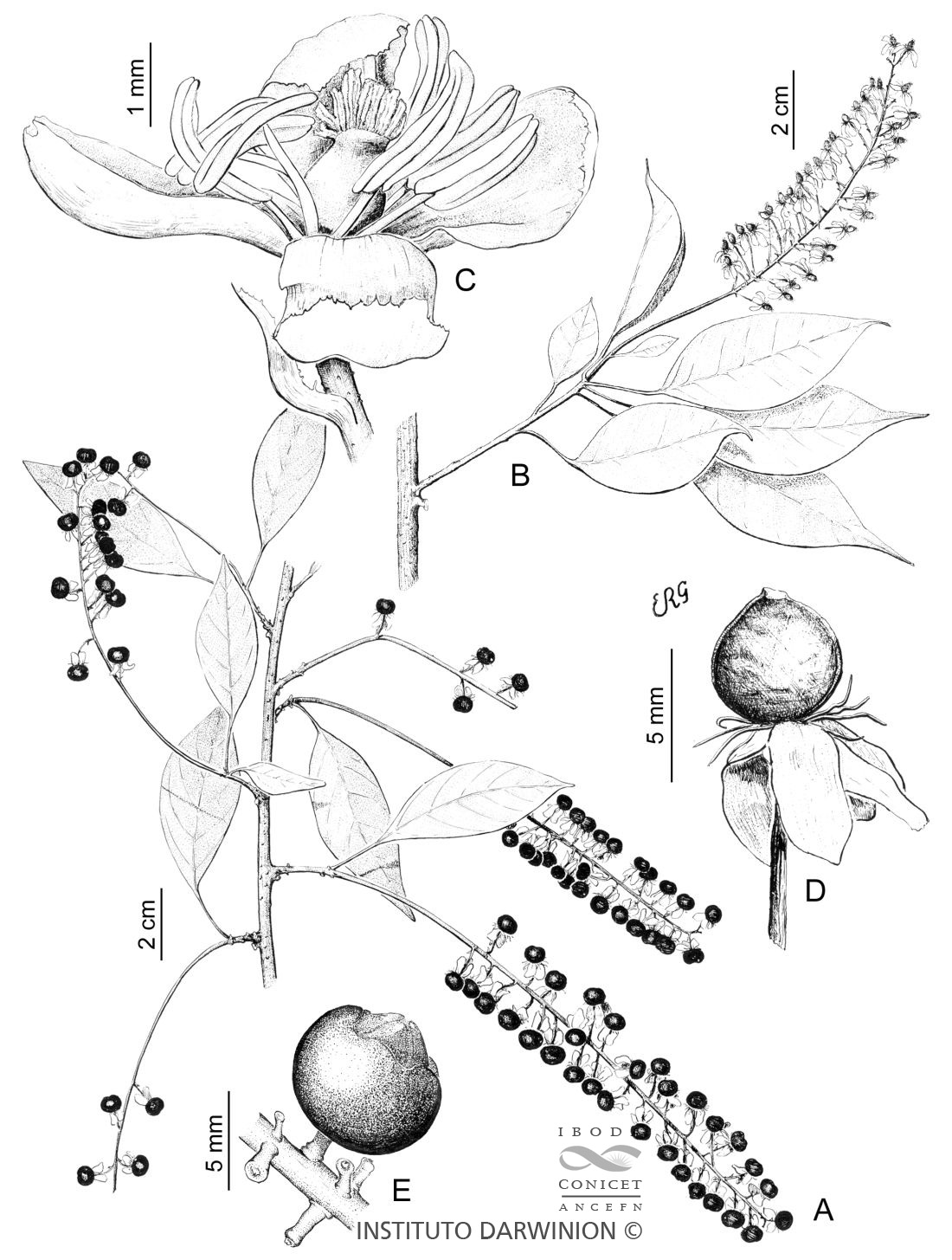 A. Planta, porción de rama fructífera con los frutos aún inmaduros. B. Planta, porción de rama florífera. C. Flor. D. Detalle del fruto inmaduro con los tépalos y estambres persistentes. E. Fruto maduro.