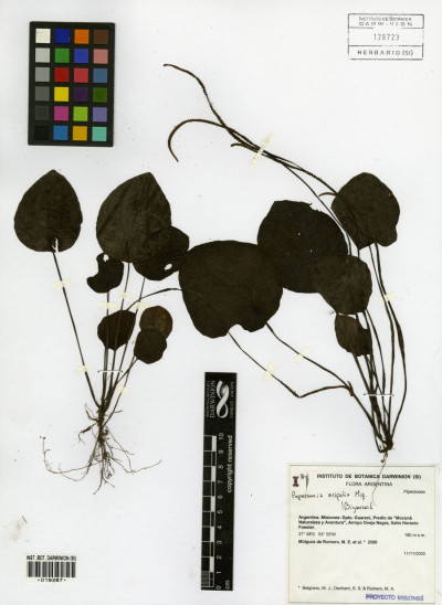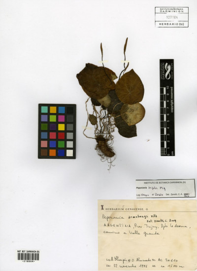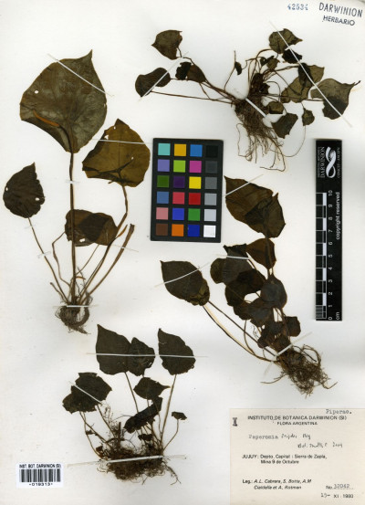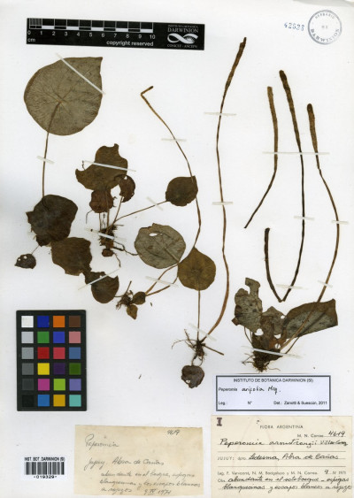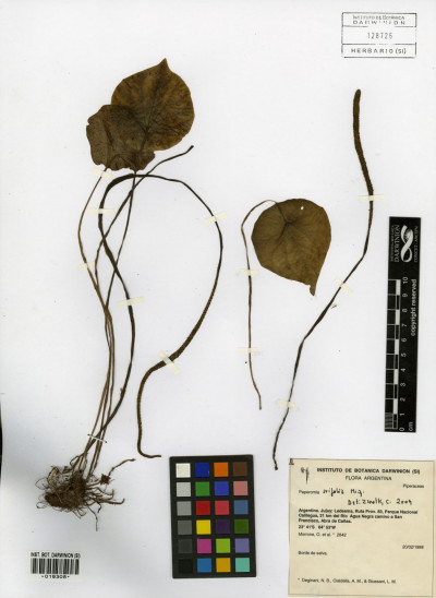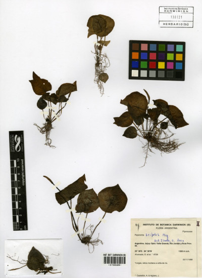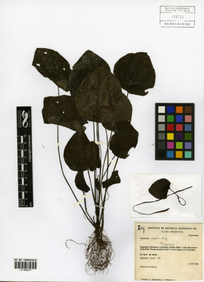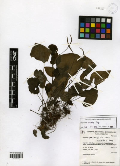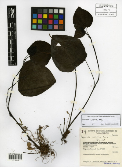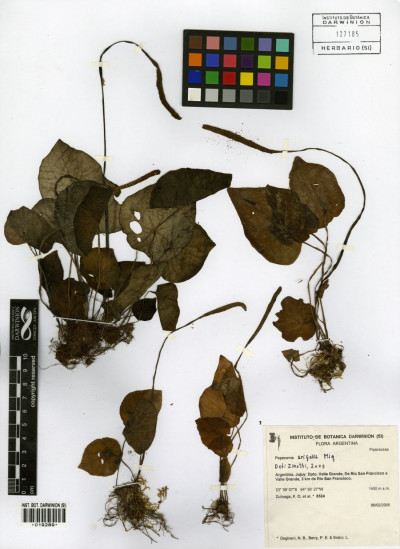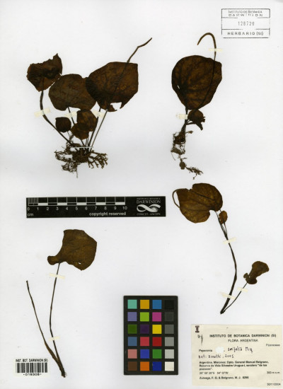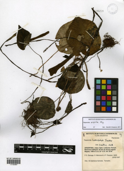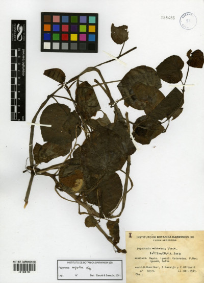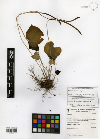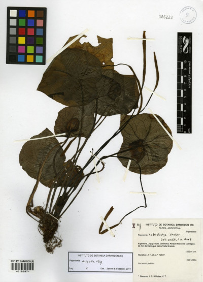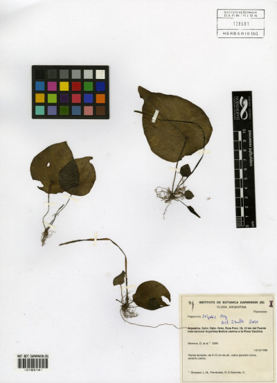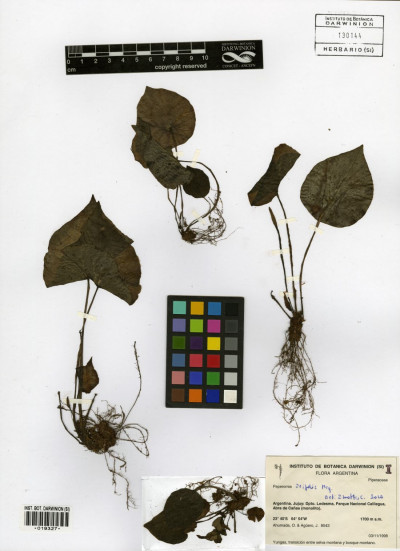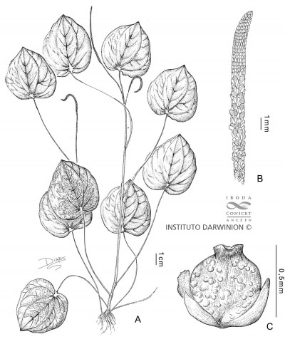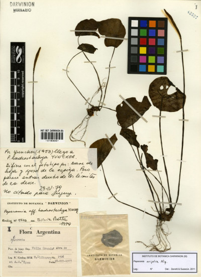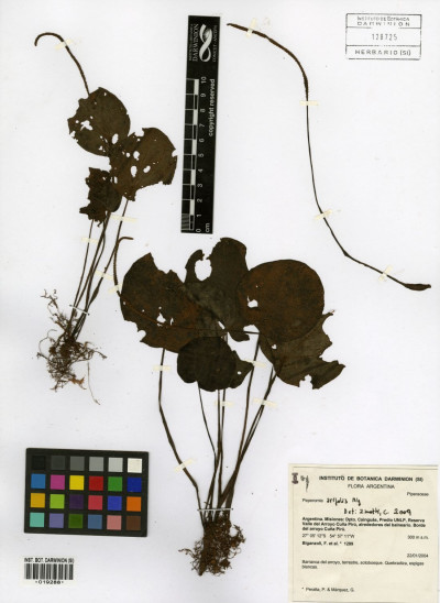 Hierbas epífitas o terrestres, a veces rupícolas, erectas, de 20-40 cm de alto; tallos con entrenudos de longitud variable desde muy breves hasta de 8 cm de largo, glabros. Hojas alternas, peltadas o subpeltadas, con pecíolos hasta de 11 cm de largo; láminas ovadas a orbicular-ovadas, de 3,5-11,5 × 2,5-7 cm, base redondeada a subcordada, ápice redondeado a obtuso, membranáceas, palmati-(7-)9-11-nervadas. Inflorescencias terminales y/o axilares, solitarias, espigas de 4-10 cm de largo: pedúnculos de 4-20 cm de largo; brácteas florales orbiculadas. Frutos subgloboso-ovoides, de 0,4-0,6 mm de largo, de superficie lisa a papilosa, estigma terminal.