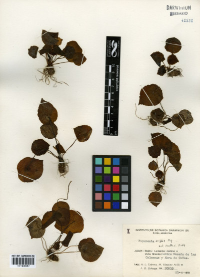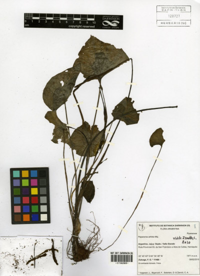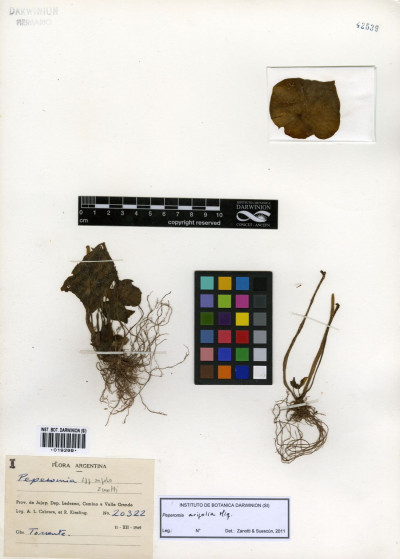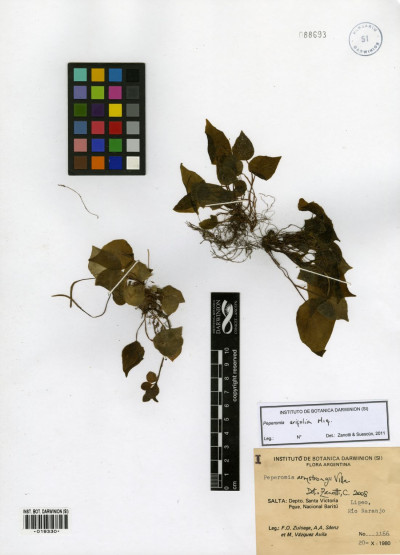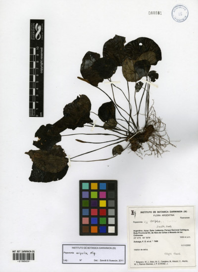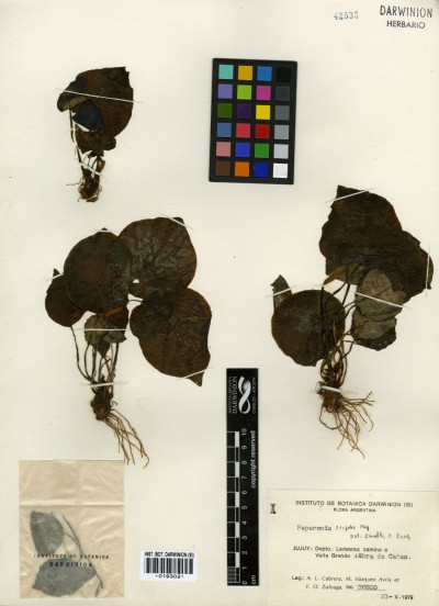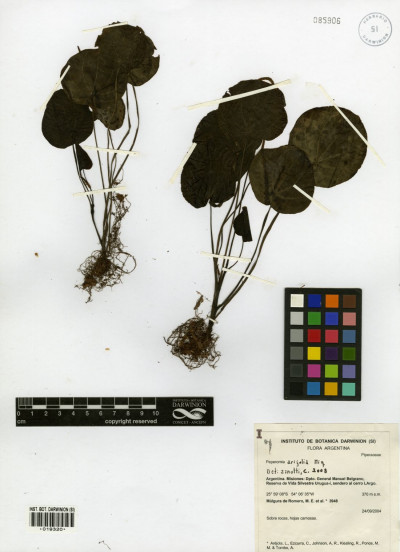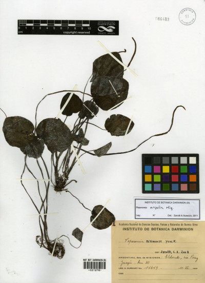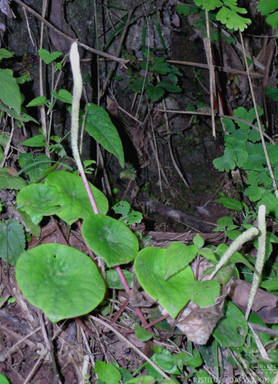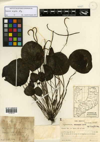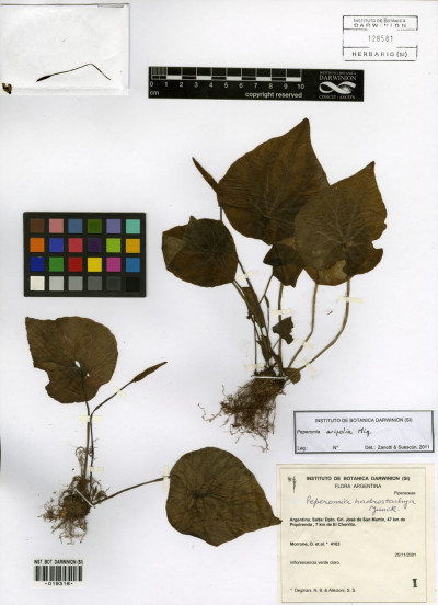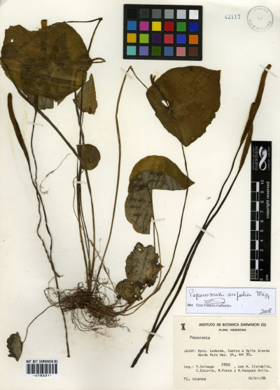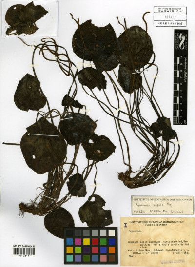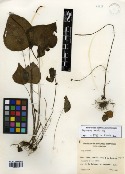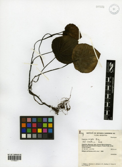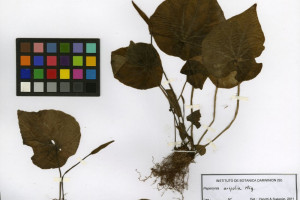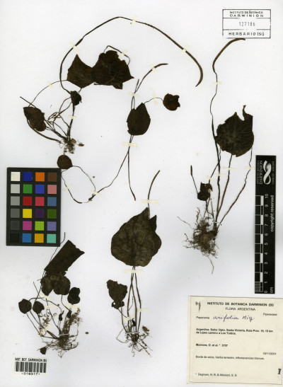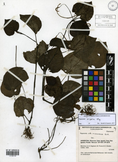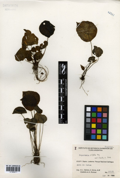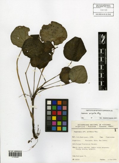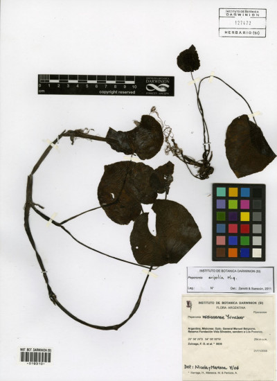 Hierbas epífitas o terrestres, a veces rupícolas, erectas, de 20-40 cm de alto; tallos con entrenudos de longitud variable desde muy breves hasta de 8 cm de largo, glabros. Hojas alternas, peltadas o subpeltadas, con pecíolos hasta de 11 cm de largo; láminas ovadas a orbicular-ovadas, de 3,5-11,5 × 2,5-7 cm, base redondeada a subcordada, ápice redondeado a obtuso, membranáceas, palmati-(7-)9-11-nervadas. Inflorescencias terminales y/o axilares, solitarias, espigas de 4-10 cm de largo: pedúnculos de 4-20 cm de largo; brácteas florales orbiculadas. Frutos subgloboso-ovoides, de 0,4-0,6 mm de largo, de superficie lisa a papilosa, estigma terminal.