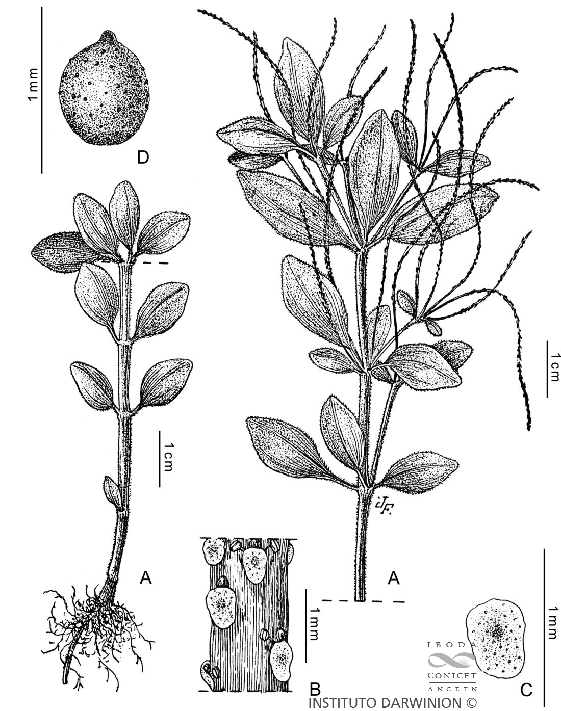 A-A´. Planta. B. Detalle de la espiga. C. Bráctea florífera. D. Fruto. Tomado de Notas preliminares para la flora chaqueña 2: 17, fig 8. 1972 (como P. blanda).