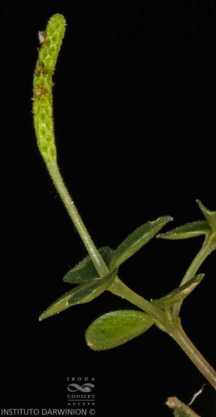 Hierbas epífitas, erectas, de 10-15 cm de alto; tallos radicantes en los nudos inferiores, entrenudos de 1-2 cm de largo, pubérulos. Hojas en verticilos de 3-4, a veces opuestas, con pecíolos de 0,1- 0,2 cm de largo; láminas elíptico-obovadas, de 0,4-10 × 0,3-0,8 cm, base aguda, ápice redondeado, cartáceas, palmati-3-nervadas, glabras a esparcidamente pubescentes, cilioladas. Inflorescencias terminales, solitarias, de 1-2,5 × 0,1 cm, densifloras; pedúnculos de 1-1,5 cm de largo, raquis verrucoso; brácteas florales orbiculares. Frutos inmersos en el raquis, ovoideo-elipsoides, de 0,8-1 mm de largo, sésiles, de superficie lisa, con pseudocúpula basal, estigma apical.