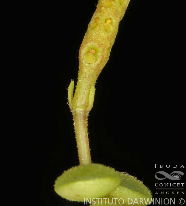 Hierbas epífitas, rastreras, delicadas; tallos filiformes, radicantes en los nudos, glabros o con diminutos pelos crespos esparcidos, entrenudos de 1-2 cm de largo. Hojas opuestas, con pecíolos de 0,5-1 mm de largo; láminas orbiculares, de 4-6 mm de diámetro, base y ápice redondeados, membranáceas, palmati-3- nervadas, pilosas, con pelos crespos o glabrescentes en ambas caras, cilioladas o no. Inflorescencias solitarias y terminales, espigas filiformes de 1-2,5 cm de largo; pedúnculos de 0,5-1 cm de largo, con 2 brácteas pedunculares opuestas en la zona media, elípticas, pilosas, cilioladas, de 0,1 cm de diámetro; brácteas florales orbiculares. Frutos ovoides, de 0,8-1 mm de largo, de superficie lisa, sésiles o estipitados, con estigma apical..