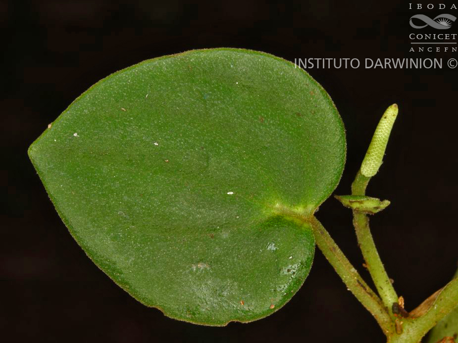 Hierbas terrestres o epifitas, erectas, de 20-40 cm de alto; tallos radicantes en los nudos, entrenudos de 2,5-6 cm de largo, crespo-pubescentes. Hojas alternas, con pecíolos de 2-4 cm de largo; láminas redondeado-ovadas, de 2,5-4,5 × 3,5-5 cm, base truncada a redondeada o subcordada, ápice cortamente acuminado, membranáceas, palmati-5-nervadas, cilioladas, membranáceas, pubescentes. Inflorescencias solitarias, axilares, con espigas de 3-4 cm de largo; pedúnculos de 2-3 cm de largo. Frutos elipsoides, de 0,8-1 mm de largo, sésiles, de superficie papilosa, con protuberancia estilar alargada (rostrada).