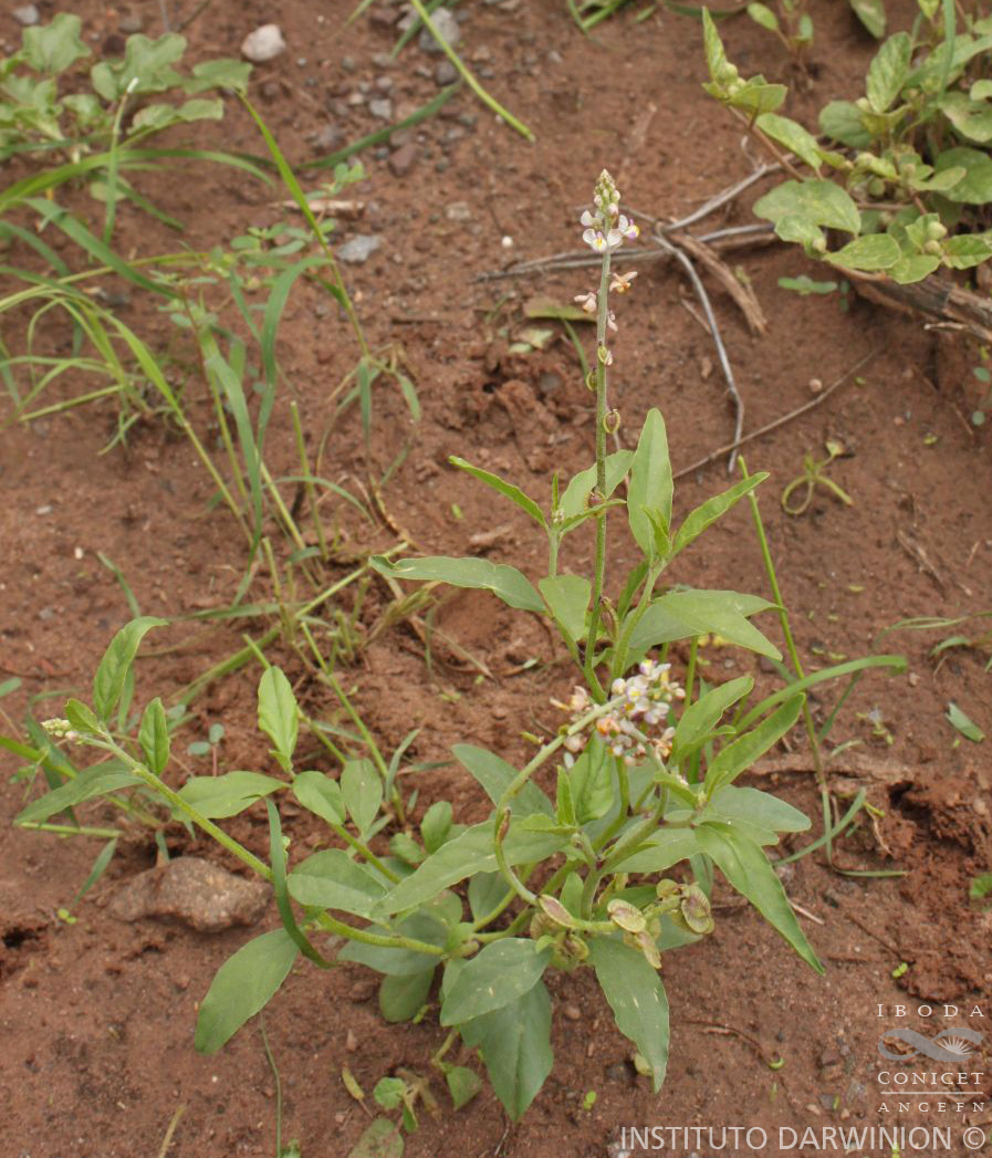 Hierbas de 13-90 cm de alto; tallos con pubescencia de tricomas glandulosos menores a 0,5 mm de largo. Hojas alternas; pecíolos de 2-3 mm de largo, pubescentes; láminas lanceoladas a oblongas, de 22-42 × 7-27 mm, ápice agudo a obtuso, mucronado, glabras o glabrescentes. Infl orescencias de 8-20 cm de largo; raquis pubescentes, nectarios extraflorales ausentes; brácteas triangulares, de 2-3,5 mm de largo, pubescentes; bractéolas de menor tamaño. Flores ca. 5 mm de largo, blancas a violáceas de ápice amarillento; pedicelos ca. 0,8 mm de largo; sépalos externos glabros; sépalo externo inferior elíptico, ca. 1,5-2 × 1 mm, ápice agudo; sépalos externos superiores elípticos, ca. 1,3 × 1 mm, ápice agudo; sépalos internos “alas” orbiculares, ca. 3,5 × 2,8 mm, ápice obtuso, glabros; quilla 3-lobulada ca. 3,8 mm de largo, pétalos laterales ca. 3 mm de largo, ápice obtuso, levemente pubescentes o glabros en la porción media adaxial, fusionados con la vaina estaminal; estambres 8, vaina estaminal ca. 2,5 mm de largo, porción libre de los filamentos estaminales separados entre sí en grupos de cuatro por una barra glabra en forma de capucha; ovario de contorno oblongo, ca. 1 × 0,9 mm, glabro; estilo curvo ca. 1,5 mm de largo, ensanchado distalmente, no auriculado, glabro, área estigmática con el lóbulo estéril agudo, lóbulo fértil 1-tuberculado. Fruto samaroide cordiforme, de 10-13 × 8-13 mm, simétrico, glabro. Semillas 2.
