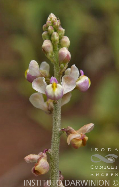 Hierbas de 13-90 cm de alto; tallos con pubescencia de tricomas glandulosos menores a 0,5 mm de largo. Hojas alternas; pecíolos de 2-3 mm de largo, pubescentes; láminas lanceoladas a oblongas, de 22-42 × 7-27 mm, ápice agudo a obtuso, mucronado, glabras o glabrescentes. Infl orescencias de 8-20 cm de largo; raquis pubescentes, nectarios extraflorales ausentes; brácteas triangulares, de 2-3,5 mm de largo, pubescentes; bractéolas de menor tamaño. Flores ca. 5 mm de largo, blancas a violáceas de ápice amarillento; pedicelos ca. 0,8 mm de largo; sépalos externos glabros; sépalo externo inferior elíptico, ca. 1,5-2 × 1 mm, ápice agudo; sépalos externos superiores elípticos, ca. 1,3 × 1 mm, ápice agudo; sépalos internos “alas” orbiculares, ca. 3,5 × 2,8 mm, ápice obtuso, glabros; quilla 3-lobulada ca. 3,8 mm de largo, pétalos laterales ca. 3 mm de largo, ápice obtuso, levemente pubescentes o glabros en la porción media adaxial, fusionados con la vaina estaminal; estambres 8, vaina estaminal ca. 2,5 mm de largo, porción libre de los filamentos estaminales separados entre sí en grupos de cuatro por una barra glabra en forma de capucha; ovario de contorno oblongo, ca. 1 × 0,9 mm, glabro; estilo curvo ca. 1,5 mm de largo, ensanchado distalmente, no auriculado, glabro, área estigmática con el lóbulo estéril agudo, lóbulo fértil 1-tuberculado. Fruto samaroide cordiforme, de 10-13 × 8-13 mm, simétrico, glabro. Semillas 2.