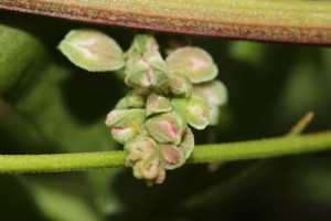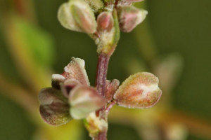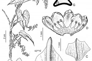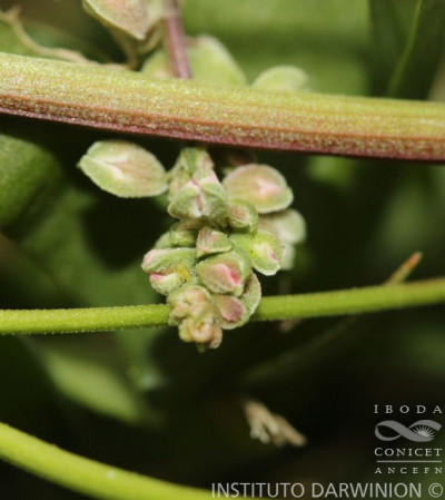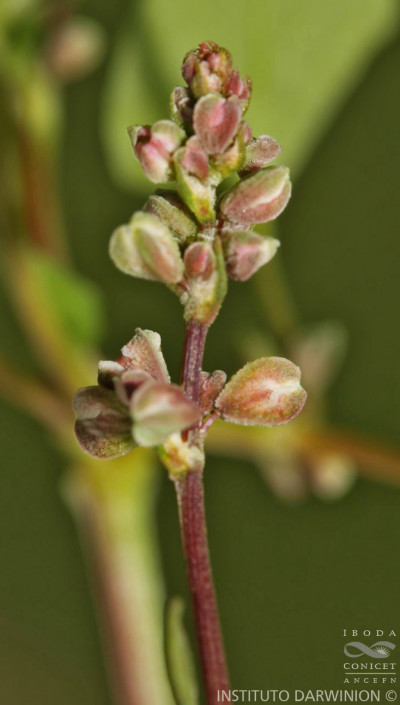 Hierbas anuales; tallos volubles, de 1-1,5 mm de diámetro, glabros. Hojas pecioladas; pecíolos de 0,5-5 cm de largo, glabros, articulados a la ócrea; láminas en general sagitadas o cordadas, de 1,5-6 × 1-3,5 cm, rara vez de base truncada, agudas en el ápice. Ócreas infundibuliformes, de 0,2-0,5 cm de largo, de borde entero, ligeramente irregular, glabras. Inflorescencia en cincinos paucifloros o multifloros (4-8 flores), axilares, solitarios o reunidos en tirsos espiciformes, laxos, de 3-8 cm de largo, con pedúnculos de 1-11 cm de largo, glabros; brácteas de los cincinos basales con lámina sagitada angosta, de 4 × 1,5 mm, pecioladas, con margen generalmente revoluto y ócrea infundibuliforme, de 1-2,5 mm de largo, con borde entero o dentado y un nervio prominente del lado de la articulación del pecíolo de la lámina; brácteas de los cincinos apicales sin lámina, reducidas solamente a la ócrea de la misma; bractéolas cilíndricas, de 1,5-2 mm de largo, de borde irregular, glabras; pedicelos de 1,5-4 mm de largo, glabros. Perigonio blanco-rosado, formado por 5 tépalos, con prefloración quincuncial, obtusos, de 2-2,5 mm de largo, glabros, los 3 más externos papilosos en la cara dorsal; androceo compuesto por 8 estambres, con filamentos algo aplanados, levemente ensanchados en su base, de 0,5-1 mm de largo, soldados entre sí; anteras de 0,5 mm de largo; gineceo 3-carpelar, ovario ovoide-trigono, de 1 mm de largo; estilo brevísimo (0,1-0,5 mm de largo) o ausente; estigmas 3, capitados, apretados entre sí. Aquenios ovoide-trígonos, de 3-4,5 × 2-3 mm, con caras notablemente cóncavas y pericarpio de superficie negro-brillante, finamente granulada.