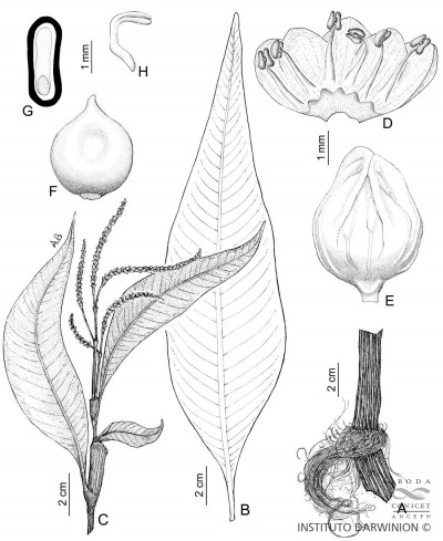 Hierbas perennes, de 1-1,5 m de alto, con base subterránea y nudos inferiores radicantes; tallos rojizos, glabros o con pelos glandulosos pequeños y pelos no glandulosos largos y delgados. Hojas pecioladas; pecíolos de 1-1,5 cm de largo, articulados a la ócrea, con pelos no glandulares, rígidos, adpresos y pelos glandulares pequeños; láminas lanceoladas, de 20-27 × 4-5 cm, de ápice agudo y base atenuada, concoloras, rojizas, glanduloso-punteadas, glabras o ligeramente pilosas, con borde y nervios principales estrigosos. Ócreas cilíndricas, de 2-3,5(-4) cm de largo, de borde ciliolado, con cara externa escasamente pilosa. Inflorescencias en cincinos multifloros (6-8 flores), reunidos en tirsos espiciformes de 4,5-6,5 × 1,5 cm, sobre pedúnculos de 1,5-4,5 cm de largo; brácteas de los cincinos infundibuliformes, de 2-2,5 mm de largo, con cara externa y borde glandulosos; bractéolas de 2 mm de largo, 2-lobadas, con 2 nervios más o menos notables, ligeramente glandulosas en su dorso; pedicelos de 2-3 mm de largo, glabros. Perigonio blanco-rosado, compuesto por 5(4) tépalos con prefloración quincuncial, (o 2 tépalos internos y 2 externos opuestos), de 3-4 mm de largo, con cara externa ligeramente glandulosa; androceo formado por 6(7) estambres, con filamentos de 2 mm de largo; anteras de 0,5 mm de largo; gineceo 2-carpelar, ovario de 1,5 mm de largo, lenticular, con leve concavidad central en ambas caras; estilos 2, de 1,5-2 mm de largo, soldados en su base; estigmas 2, capitados. Aquenios lenticulares, de 3 × 3 mm, con caras planas, ligeramente cóncavas en el centro y pericarpio de superficie negro-brillante, levemente granulada.