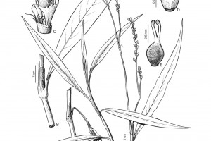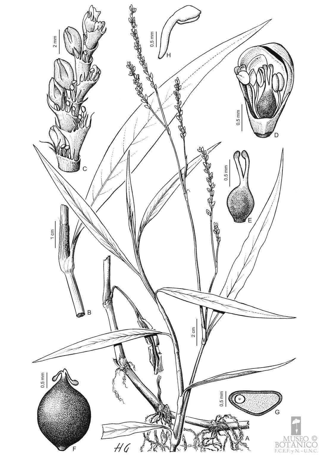 A. Planta. B. Nudo con hoja y ocrea. C. Sector de inflorescencia. D. Flor con un tépalo extirpado. E. Ovario. F. Fruto. G. Transcorte por semilla. H. Embrión (de A. T. Hunziker 14525, CORD).