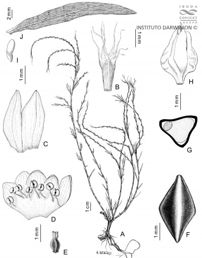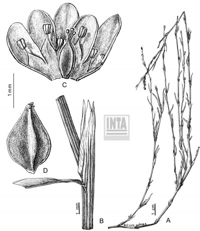 Hierbas perennes, de 30-40 cm de alto, con raíces leñosas; tallos robustos, leñosos, ascendentes, rectos, conspicuamente sulcados, glabros, poco ramificados desde la base. Hojas sésiles, lineales hasta aciculares en el ápice de las ramitas, de 1,5-4 × 0,2-0,5 cm, agudas, de margen levemente revoluto y rígido y base suavemente atenuada que se articula a la ócrea, glabras, con epifilo estriado e hipofilo con nervios notables. Ócreas 2-lobadas, de 0,6-0,7(-2) cm de largo, de margen entero en los nudos apicales y borde notablemente laciniado en los nudos basales, con frecuencia mucho más cortas que los entrenudos. Inflorescencia en cincinos paucifloros (3-4 flores), rara vez multifloros, formando en conjunto pleiotirsos; brácteas de los cincinos con lámina y ócrea similares a las de los nudos vegetativos; bractéolas de 3-5 mm de largo, glabras; pedicelos de 2-7 mm de largo, glabros. Perigonio blanco-verdoso, levemente carnoso, compuesto por 5 tépalos con prefloración quincuncial, obtusos, de 2,5-3 mm de largo, glabros; androceo formado por 8 (raro 5-6) estambres, dispuesto en 2 ciclos (5 + 3), con filamentos de 1-1,5 mm de largo, de base dilatada; anteras de 0,5 mm de largo; gineceo 3-carpelar, ovario ovoide, de 1 mm de largo, trígono, de caras cóncavas; estilos 3, libres, de 0,5 mm de largo, que rematan en estigmas capitados. Aquenios ovoide-trígonos, de 3-4 × 1,5-2 mm, con caras ovadas, cóncavas, de ápice agudo y pericarpio de superficie castaña, lisa.