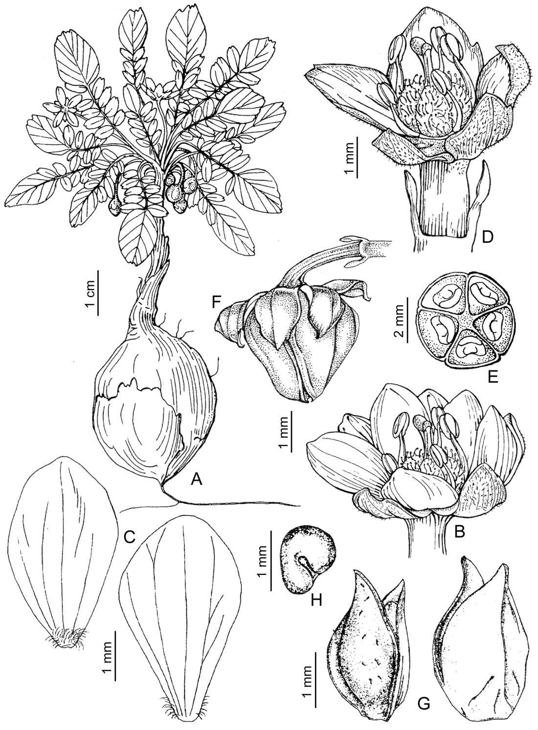 Hierba perenne; raíz con porción tuberosa de 4-6 cm de largo × 2-3,5 cm de diámetro. Hojas de 2,5-5(-10) cm de largo, pinnadas; pecíolos glabros dilatados en la porción basal, márgenes casi membranosos; folíolos 11-17, alternos o subopuestos, sésiles, los laterales elípticos u oblongos, de 5-14 mm de largo, folíolo terminal ovado, de 7-18 mm de largo, entero o con tres dientes obtusos o, más comúnmente, emarginado con un mucrón o diente medio. Inflorescencias con pedúnculos de 6 cm de largo, 1-fl oros. Flores con corola blanca de 0,5-0,8 cm de diámetro; estambres 5 en un ciclo, opositipétalos; ovario densamente glanduloso-pubescente. Fruto esquizocarpo, mericarpos 1-pauciseminados.
