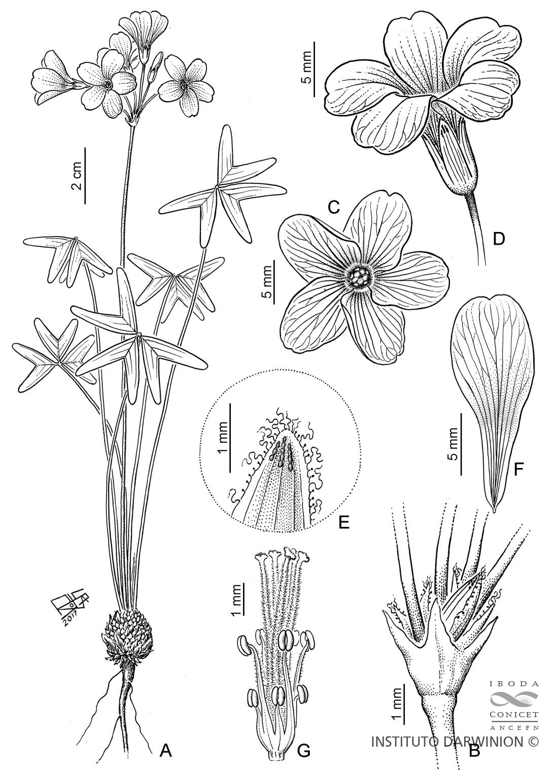 Hierbas bulbosas, hasta de 45 cm de alto. Raíces napiformes, con numerosas ramificaciones, fibrosas; presencia de bulbos, ovoides, formados por escamas protectoras ovado-oblongas, escariosas, pardas, hialinas, 3-nervadas, con el borde glabro o con pelos finísimos, lanosos, desiguales, hacia el ápice; escamas nutricias engrosadas, ovadas, cóncavo-convexas, blancas, agudas o acuminadas, bordes hialinos, lanoso-pilosos. Hojas 3- 5; estípulas hialinas, pardas, completamente soldadas al pecíolo; pecíolos hasta de 45 cm de largo, a veces suculentos; peciolulos inconspicuos o hasta de 0,5 mm de largo, comúnmente sin pubescencia en la inserción; folíolos 3, obcordados, hasta de 50 × 50 mm, emarginados, incisos 1/3-3/4, discoloros, envés con superficie celulosa, con lóbulos divergentes, triangular-oblongos a lineares; calli ausente. Cimas umbeliformes, (2-3)-5-10-floras, sobrepasando el follaje; pedúnculos hasta de 40 cm de largo; brácteas 3-5, semicirculares a ovadas, mucronadas, hialinas, 1- nervadas; bractéolas lanceoladas o lineares, agudas, mucronadas; pedicelos hasta de 55 mm de largo. Flores hasta de 40 mm de diámetro; sépalos elípticos a lineares, verdosos, bordes hialinos, 3-5-nervados, ápice obtuso, retuso o subagudo, glabro o con pelos finos; calli presente; pétalos obovados, unguiculados, 2-3 veces el largo de los sépalos, rosados a rojo oscuro, base blanca. Cápsulas cilíndricas, glabras, interiormente pubescentes. Semillas 12-14, ovoideas, agudas, 8-9-costadas, con estrías transversales, ocres.