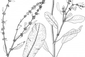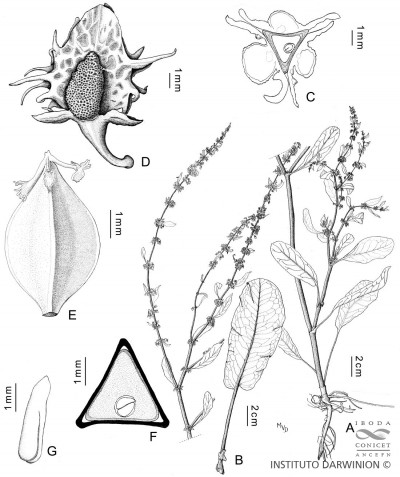 Plantas polígamas, anuales o bienales, de 12-85 cm de alto; tallos erguidos, a veces flexuosos hacia el ápice. Hojas pecioladas; pecíolos de 6,5-10 cm de largo; láminas obovadas u oblongas, de 6-13 × 1,5-5,5 cm, obtusas, de base cuneada, truncada o cordada, lanceolada hacia el ápice del tallo, con margen levemente crespo. Ócreas de borde oblicuo, levemente irregular. Inflorescencias extendidas, bracteadas; pedicelos de 1,5-4 mm de largo. Perigonio con tépalos oblongos, de 1,5-2 mm de largo, enteros o bien denticulados hacia la base; estambres con filamentos de 1-1,5 mm de largo; anteras de 0,5-1 mm de largo; ovario ca. 0,5 mm de largo; estigmas fimbriados. Valvas fructíferas ovadas o deltoides, de 3,5-5,5 × 2,3-3,5 mm, de ápice obtuso o agudo, reticuladas, con 3-5 dientes a cada lado, notablemente agudos, algunos de ellos a veces basalmente soldados entre sí; callo ovoide, foveolado o rugoso, presente en las 3 valvas, generalmente uno mayor que los otros 2. Aquenios ovoideo-trígonos, de 2,5-3,5 mm de largo, con caras planas o cóncavas.