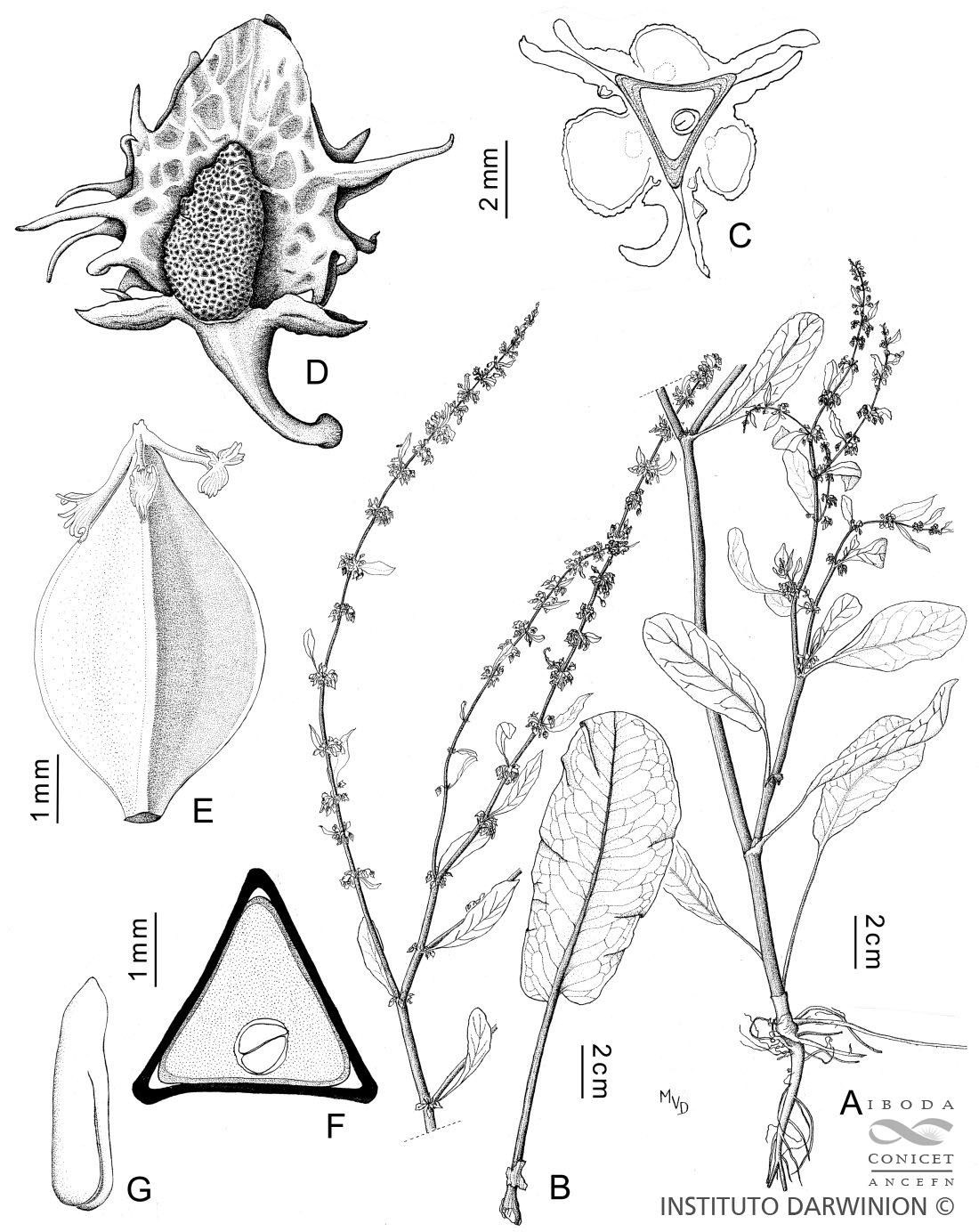 A. Planta en flor. B. Hoja. C-D. Fruto cubierto por los tépalos internos (valvas fructíferas), corte transversal y vista lateral, respectivamente. E-F. Aquenio, vista lateral y corte transversal, respectivamente. G. Embrión.