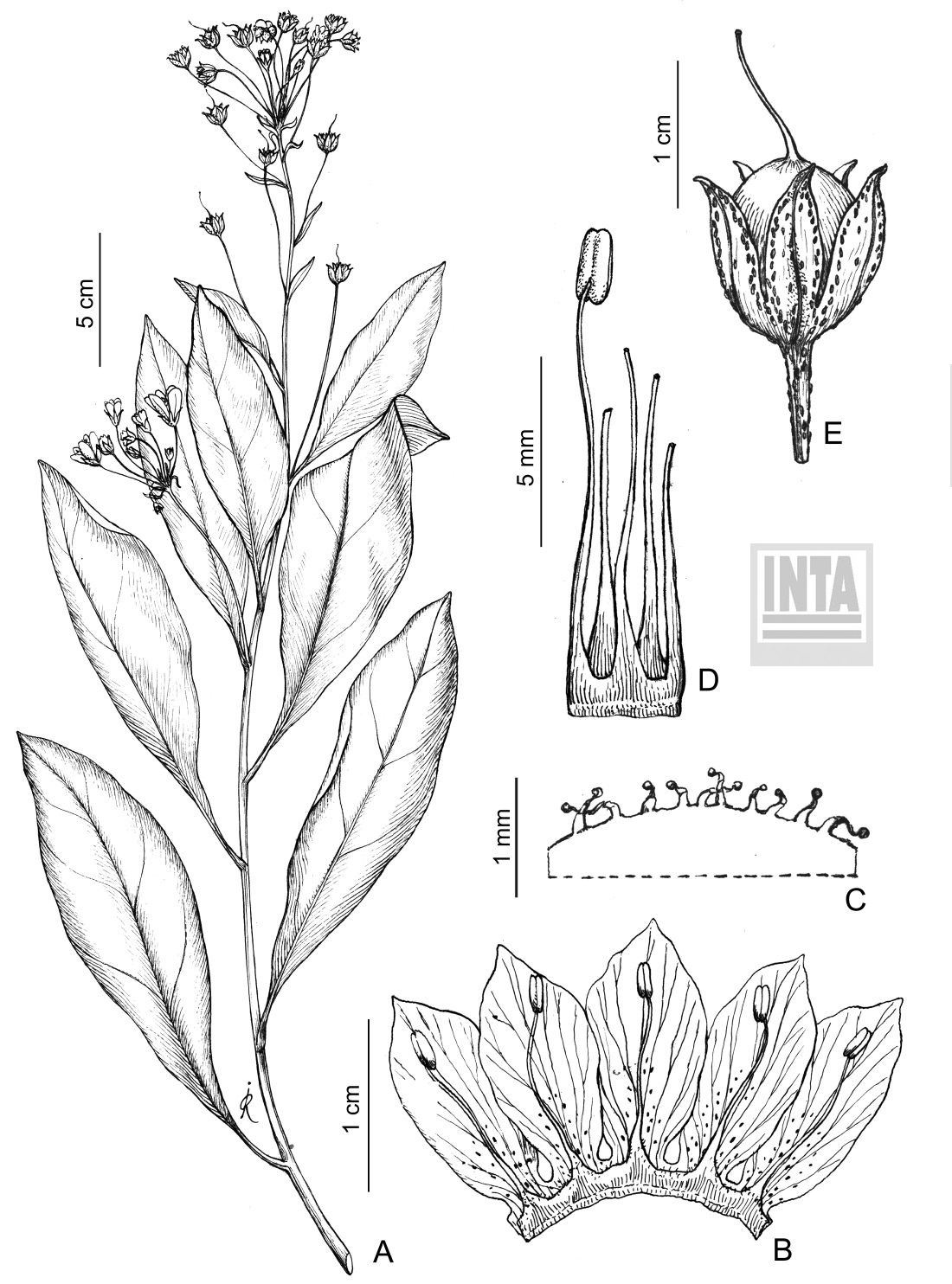 A. Rama florífera. B. Flor con la corola desplegada. C. Detalle del borde de la corola. D. Detalle del tubo estaminal. E. Fruto con el cáliz persistente.