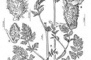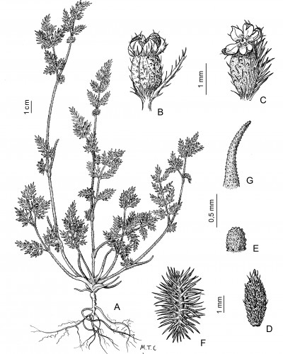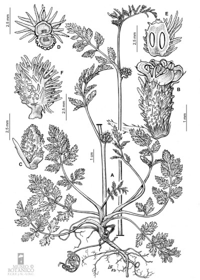 Hierbas anuales de 10-60 cm de alto, decumbentes; tallos híspidos. Hojas basales 2-3 pinnatisectas; lámina obloga de 6-12 × 2-4 cm, con 7-11 pinnas primarias ovadas de 1-3 cm de largo, incisas a pinnatifidas, últimos segmentos agudos; hojas caulinares semejantes, menores, menos divididas. Umbelas capitadas, opuestas a las hojas, las inferiores cortamente pedunculadas, las distales sésiles; radios 2-3 muy breves u obsoletos, involucro ausente; umbélulas paucifloras, pedicelos breves u obsoletos, involucelo de 6-8 bractéolas linear-subuladas, híspidas. Flores blancas. Frutos ovoideos, de 2,5-4,5 × 2 mm, los interiores de la umbela cubiertos de tubérculos o papilas, los exteriores equinados con espinas gloquidiadas, al menos en su mericarpio externo.