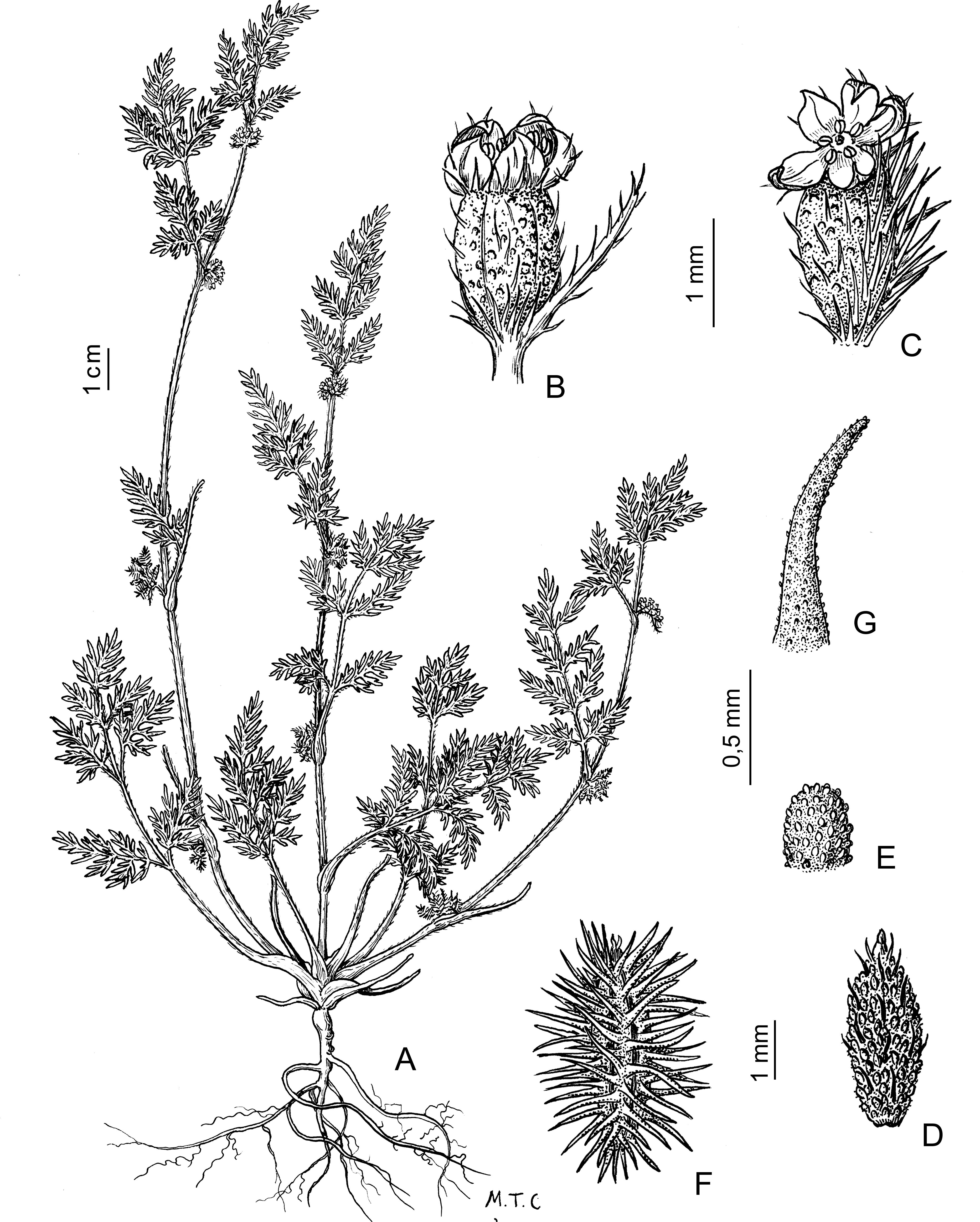 A. Planta. B-C. Flores. D-E. Fruto tuberculado y detalle de tubérculo. F-G. Fruto espinoso y detalle de espina.
