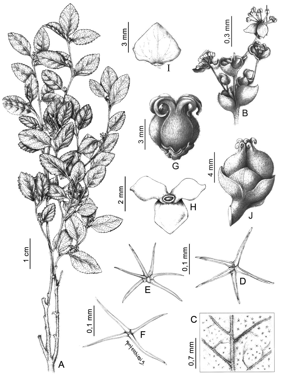 A. Rama florífera. B. Inflorescencia. C. Cara abaxial de la lámina foliar, sector mostrando la disposición de los tricomas. D-F. Tricomas estrellados. G. Gineceo. H. Perianto de la flor pistilada mostrando el nectario anular. I. Bráctea de la flor pistilada. J. Flor pistilada.