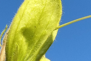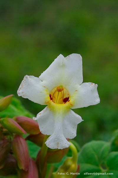 Hierbas anuales hasta de 50 cm de alto, pubescentes y viscosas; tallos cilíndricos, fistulosos, de ramificación cimoso-dicotómica. Hojas opuestas, pecíolos pubescentes hasta de 20 cm de largo; láminas ovado-cordadas o reniformes, cordadas en la base, obtusas, enteras o dentadas, densamente pubescentes en la haz. Inflorescencias en racimos terminales 28-30-floros, hasta de 30 cm de largo; pedicelos con bráctea lineares caducas en su base y con 2 bractéolas lineares debajo del cáliz. Cáliz espatáceo, membranáceo, inflado, entero, 3-5 dentado en el ápice, dorsalmente; ventralmente glabro, dorsalmente villoso; corola subcampanulada, blanca, de 16-18 cm de largo, garganta con manchas color castaño o morada en su interior; tubo corolino 4-5 veces la longitud del cáliz; limbo de 5 lóbulos redondeados, extendido, ca. 6 cm de diámetro; estambres 4, didínamos, sin estaminodios; ovario pequeño, ovalado, glabro; estilo largo; estigma 2-fido. Cápsulas leñosas, ovoides, ca. 5 × 3 cm, cara inferior lisa y globosa, cara superior con cresta de espinas y ápice con 2 apéndices cortos. Semillas 4-5, alargadas y encorvadas, con testa negra, coriáceas.