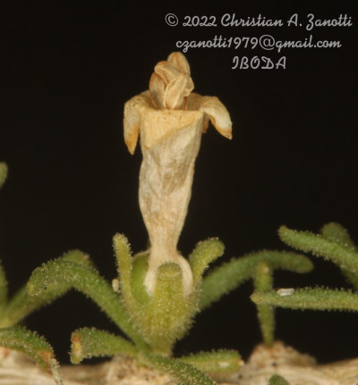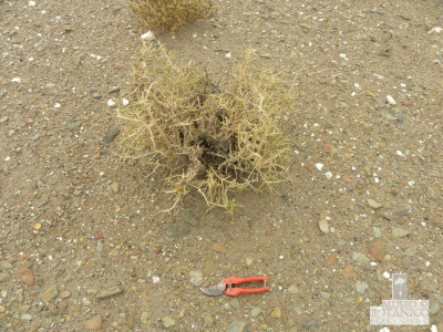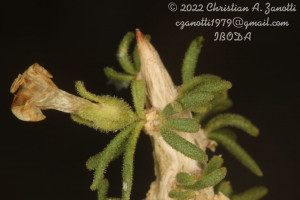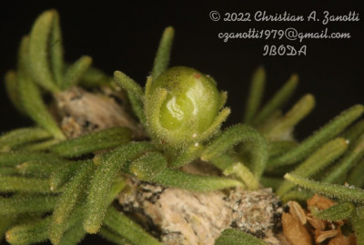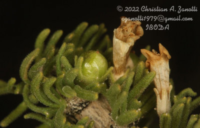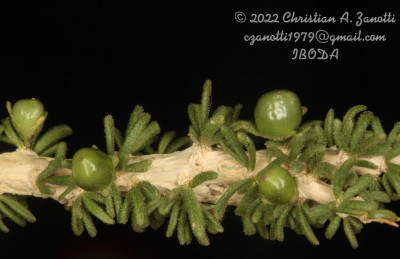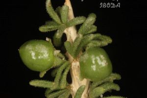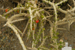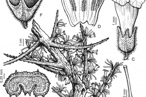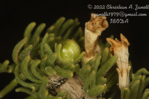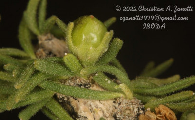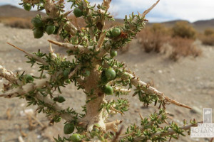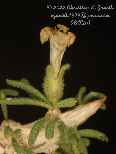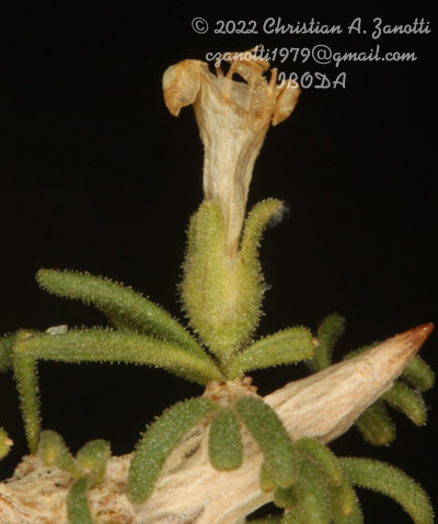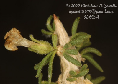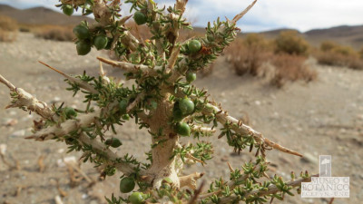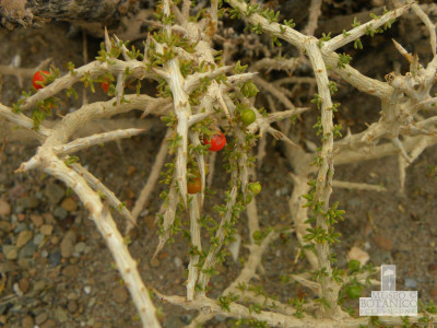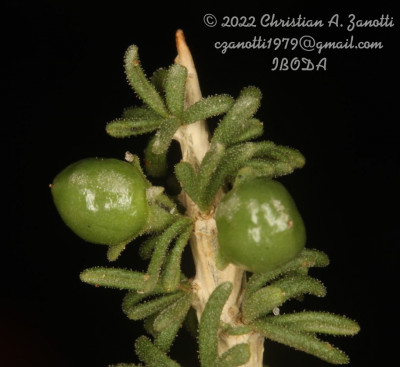 Arbustos de 0,3-1(-1,75) m de alto; tallos ramificados, castaño claro o grisáceos, glabros, con corteza rugosa, ramas gruesas y rígidas, agudas en el extremo, rectas o arqueadas. Hojas sésiles, pubescentes con tricomas simples y glandulares; láminas lineares a linear-obovadas, con el margen revoluto, pequeñas, de 2-12 × 0,3-0,5 mm. Flores 4(-5)-meras, solitarias; cáliz acopado, irregular o regularmente dentado, a veces 2-3-labiado, pubescente, tubo de (1,5-)2-3 mm, lóbulos de 1,5-2,5 mm; corola blanca, blanco- amarillenta o blanco-lilacina, angostamente infundibuliforme, glabra a pilosa por fuera, con tubo de (5-)6-9 × 2,5-3,5 mm, lóbulos de 1,5-2,3 × 2-2,5 mm; estambres adheridos al tubo corolino en su tercio basal, filamentos subiguales, poco exertos, pubescentes en su base; ovario con nectario prominente, rojoanaranjado, estilo incluso. Baya roja, subglobosa, ca. 4 × 3 mm, con dos pequeñas concreciones esclerosas macroscópicas en el ápice, 1 por carpelo; semillas reniformes a subcirculares, 1-4 por lóculo, de 2-2,5 × 1,5-2 mm, episperma más o menos liso, con celdillas de paredes muy onduladas, poco marcadas..