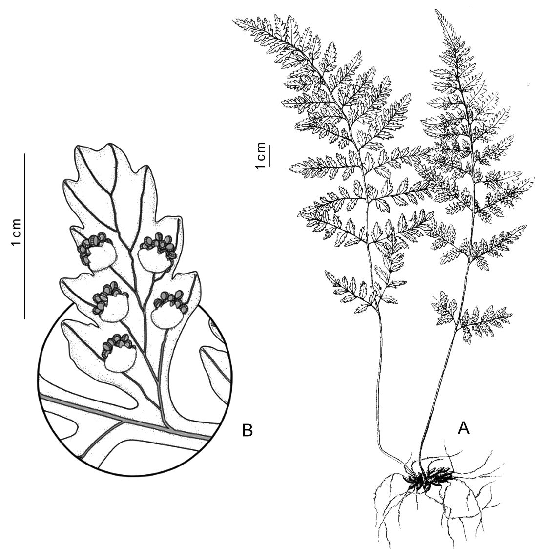 A. Planta. B. Detalle de una pínnula mostrando la venación, los soros, indusios y esporangios.