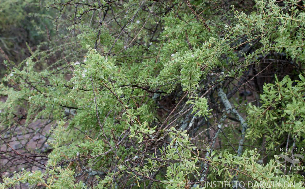 Arbustos de 0,7-2,5 m de alto; tallos castaño-oscuros o grisáceos, pubescentes cuando jóvenes, luego glabros, con braquiblastos marcados, ramificados, con ramas espiniformes por lo general perpendiculares a la rama que las soporta. Hojas planas; láminas filiformes, linear-obovadas o lineares, de 2,5- 30(-40) × 0,5-3(-5) mm, atenuadas en la base, generalmente obtusas en el ápice, membranáceas, glabras, glabrescentes o pubescentes, con tricomas simples y glandulares. Flores 5-meras, raro 6-meras, solitarias, con frecuencia arqueadas; cáliz tubuloso 5-6-dentado, con dientes irregulares, más largos, iguales o más cortos que el tubo, glabro a pubescente con pelos simples y glandulares, tubo de 1,8-3 mm, lóbulos angostamente subtriangulares, de 1-3 mm, agudos o acuminados; corola violácea o lilacina, con la parte interna del tubo más oscura y nervaduras atropurpúreas en los lóbulos y en el tubo, glabra externamente, más raro pubescente, pilosa en su interior formando un anillo en la zona de inserción de los estambres y por debajo de ella, más densamente en los hacecillos estaminales, tubulosa, ensanchándose en forma suave hacia el ápice y un poco contraída por encima del ovario, tubo de 8-10(-12,5) × 2-3 mm, lóbulos subtriangulares de 2-3 × 1,5-2,3 mm; estambres adheridos al tubo corolino a distinto nivel, más arriba de su hemialtura, filamentos desiguales, generalmente 2 más largos que llegan hasta el nacimiento de los lóbulos y son apenas exertos y los 3 restantes más cortos e incluidos, con pelos esparcidos en su base; ovario con nectario verde e inconspicuo, estilo exerto. Baya ovoide, roja, atropurpúrea o anaranjada, de 4-6 × 3-4 mm; semillas reniformes, 8 a 15 por lóculo; episperma con celdillas de paredes onduladas, muy marcadas. Lycium