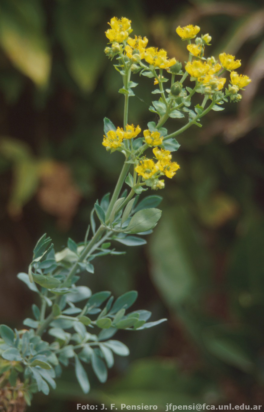 Subarbusto de 50-150 cm de alto; ramificado, de color verde glauco, glabro, fétido. Hojas 2-pinnatipartidas; segmentos oblongos a ovoides, de 9 cm de largo, punteado-glandulosos y de color verde claro. Inflorescencias en cimas corimbiformes. Flores 4-meras, amarillo-verdosas; sépalos ovados, de 3-4 mm de largo, connados en la base; pétalos obovado-oblongos, de 6-7 mm de largo, de borde laciniado e incurvos hacia el ápice; estambres 8, oposotipétalos, los filamentos ensanchados en la base, anteras de contorno oblongo; ovario de 2-2,4 mm de largo, verrucoso y carnoso, estilo subginobásico. Fruto una cápsula ovoide, de 6-7,8 mm de largo. Semillas rugosas, de 2 mm de diámetro.