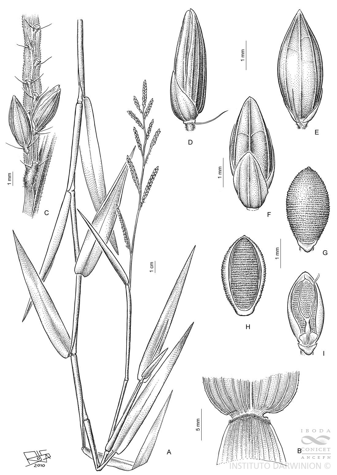 A. Caña florífera. B. Región ligular. C. Porción de un raquis de la inflorescencia. D. Espiguilla vista lateral. E. Espiguilla vista dorsal. F. Espiguilla vista ventral. G. Antecio superior vista dorsal. H. Antecio superior vista ventral. I. Pálea superior con lodículas y gineceo.