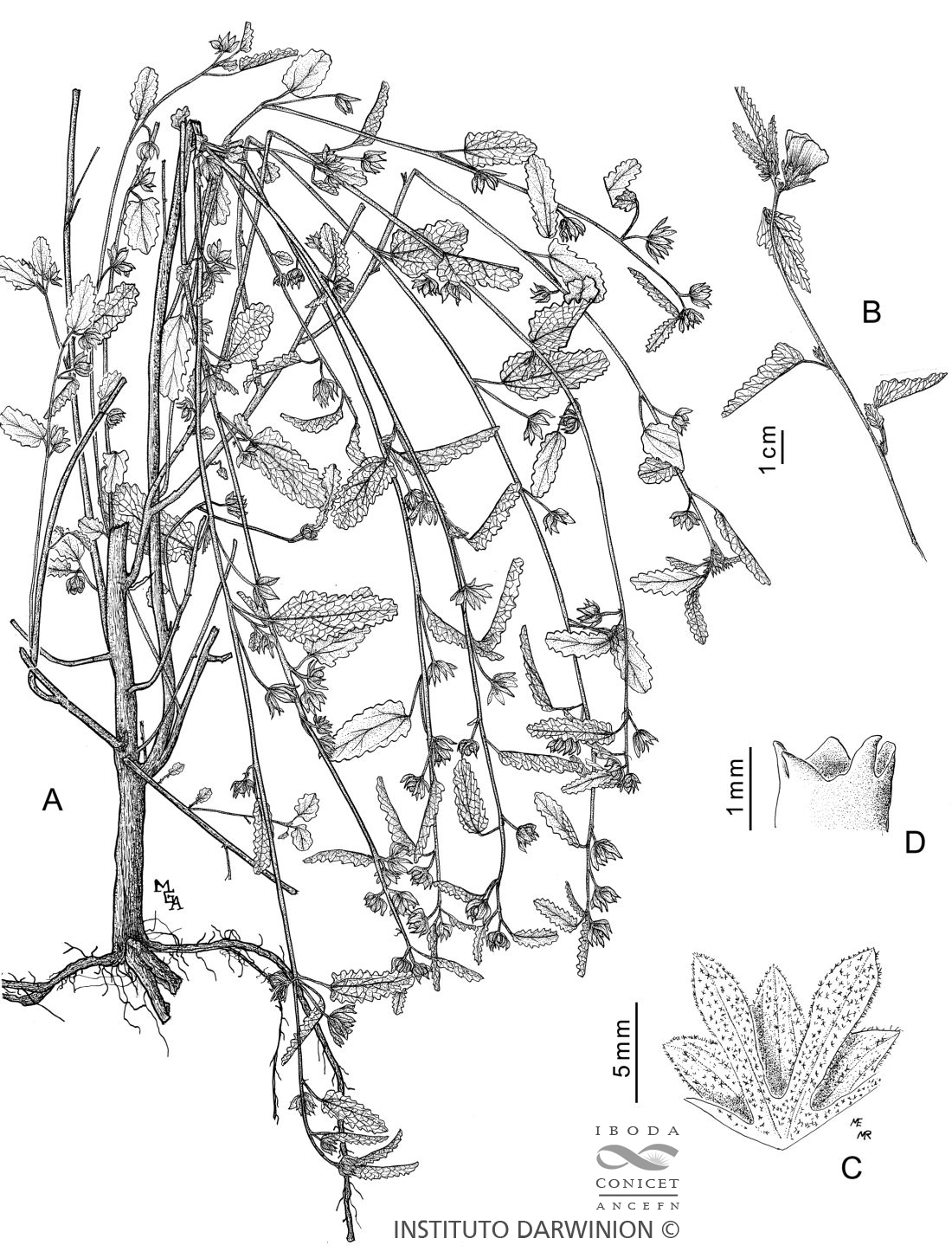 Arbusto erecto, hasta de 1,50 m de altura. Estipulas subuladas, 1,5-2,5 mm de largo. Lámina oblongo-lanceolada a oval-lanceolada, a veces hastada, base levemente cuneada o redondeada, 4 × 1 cm, margen levemente crenado o aserrado, ambas caras cubiertas de pelos cortos, ramificados, algo hirsutos, no glandulosos, algo más numerosos en el envés. Flores solitarias agrupadas hacia el extremo de las ramas. Pedúnculos 0,5-1 cm de largo. Bractéolas 5, espatuladas, obtusas, 9 × 1,5-2,5 mm, cubiertas de pelos cortos, estrellados. Cáliz 8 mm de largo, lóbulos aovados 6 × 3,5 mm, 5-nervados, cara interna glabra, cara externa con pelos cortos sobre las nervaduras. Pétalos rosados, con nervadura y mancha basal oscuras, 20 × 1,5 mm, uña algo pilosa, cara externa con pelos glandulosos en las partes no imbricadas. Tubo estaminal 6,5 mm de largo, borde dentado, estambres libres en el tercio superior del tubo. Estilos sobresaliendo 2,5 mm del tubo estaminal. Carpelos 3,5 × 3 mm, múticos, casi lisos, solo prominentes el nervio medio y una nervadura longitudinal a cada lado. Semilla lisa, con dos mechones de pelos. Cromosomas: 2n = 56. [Arbustos eretos a ereto-decumbentes de até 1,6 m de altura, às vezes radicantes nos nós; ramos densamente cobertos por tricomas estrelados, algo hirsutos e ferru- gíneos. Folhas com lâminas lanceoladas a estreitamente elípticas, 1,7-9,2 x 0,5-2 cm, base cuneada, hastada, truncada ou arredondada, faces adaxial e abaxial com tricomas estrelados, mais densos sobre a nervura central da face abaxial, levemente discolores; estípulas subuladas a lineares, 3-5 mm de compr. Flores axilares solitárias ou agregadas no ápice dos ramos; pedicelos 0,1-1,7 cm compr.; epicálice com 5 bractéolas, oblanceoladas, 8-12 x 1,5-3 mm; cálice com nervuras roxas ou negras; corola branco-rosada, com nervuras vináceas na face abaxial das pétalas e com mancha basal vinácea na base da face adaxial, 1,5-2,5 x 1-1,5 cm; tubo estaminal 6-6,5 mm compr. Mericarpos 3,5-4 x 2,5-3 mm, levemente carenados no dorso e com uma nervura longitudinal saliente de cada lado, o restante apenas estriado, quase liso, pubescentes, múticos.]