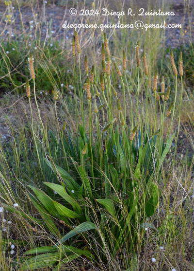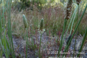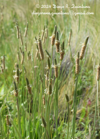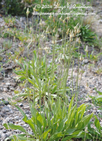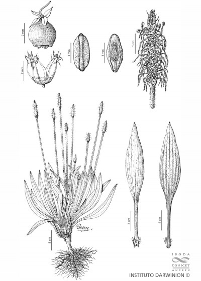 Hierbas perennes, de 0,13-0,60 m de alto; raíz primaria corta y con numerosas raíces secundarias, fasciculadas. Hojas arrosetadas, alternas; láminas lanceoladas, de 10,5-13 × 1-2 cm, glabrescentes en ambas caras, ápice agudo, base atenuada formando un pseudopecíolo de 1-2,5 cm de largo, margen entero o con dientes inconspicuos, venación paralelinervada con 5 nervios. Espigas multifloras, cónicas u ovoides cuando jóvenes, cilíndricas y congestas a la madurez, de 2,5-4 cm de largo; escapos erectos o ascendentes, de 11-45 cm de largo, canaliculados. Flores en la axila de una bráctea deltoidea, de 2,3-5 mm de largo, ápice agudo o bien obovadas; cáliz con sépalos anteriores connados hasta la mitad de su longitud, elípticos, de 2,4-3,2 mm de largo, los posteriores libres con carena velluda; corola con el tubo glabro, lóbulos cuspidados, ovados; estambres 4, exertos; ovario bilocular, de 1,2-1,4 mm de largo. Pixidio elipsoide, de 3-4,7 mm de largo, 2-seminado. Semillas de 1,5-2,5 mm de largo, testa lustrosa, lado placentar convexo.