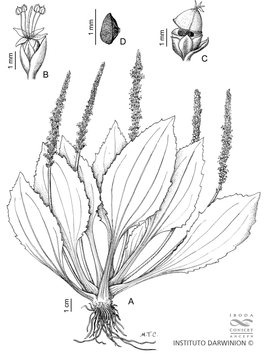 Hierbas perennes, rizomatosas, hasta de 0,4 m de alto. Hojas arrosetadas, con pecíolos de 3-12 cm de largo, canaliculados; láminas ovadas a ovado-elípticas, de 6-15 × 3-10 cm, glabras o parcialmente híspidas en ambas caras, con 3-9 venas principales, ápice obtuso, margen sinuado o dentado. Espigas cilíndricas, multifloras, de 6-18 cm de largo, con flores dispuestas en espiral; escapos ascendentes o bien erectos, de 6-30 cm de alto. Flores en la axila de una bráctea de 1,2-2 mm de largo, ovado-triangular, cóncava, glabra, con carena angosta; cáliz con sépalos connados sólo en la base, membranáceos, elípticos, glabros, de 1,7-2 mm de largo; corola con el tubo glabro, lóbulos ovados, obtusos, de 1 mm de largo; estambres 4, insertos en el tercio inferior del tubo corolino. Pixidio cónico, de 2-4 mm de largo, con 6-31 semillas. Semillas ovoides a ovoideo-elipsoides, pardo-oliváceas, de 1-1,5 mm de largo.