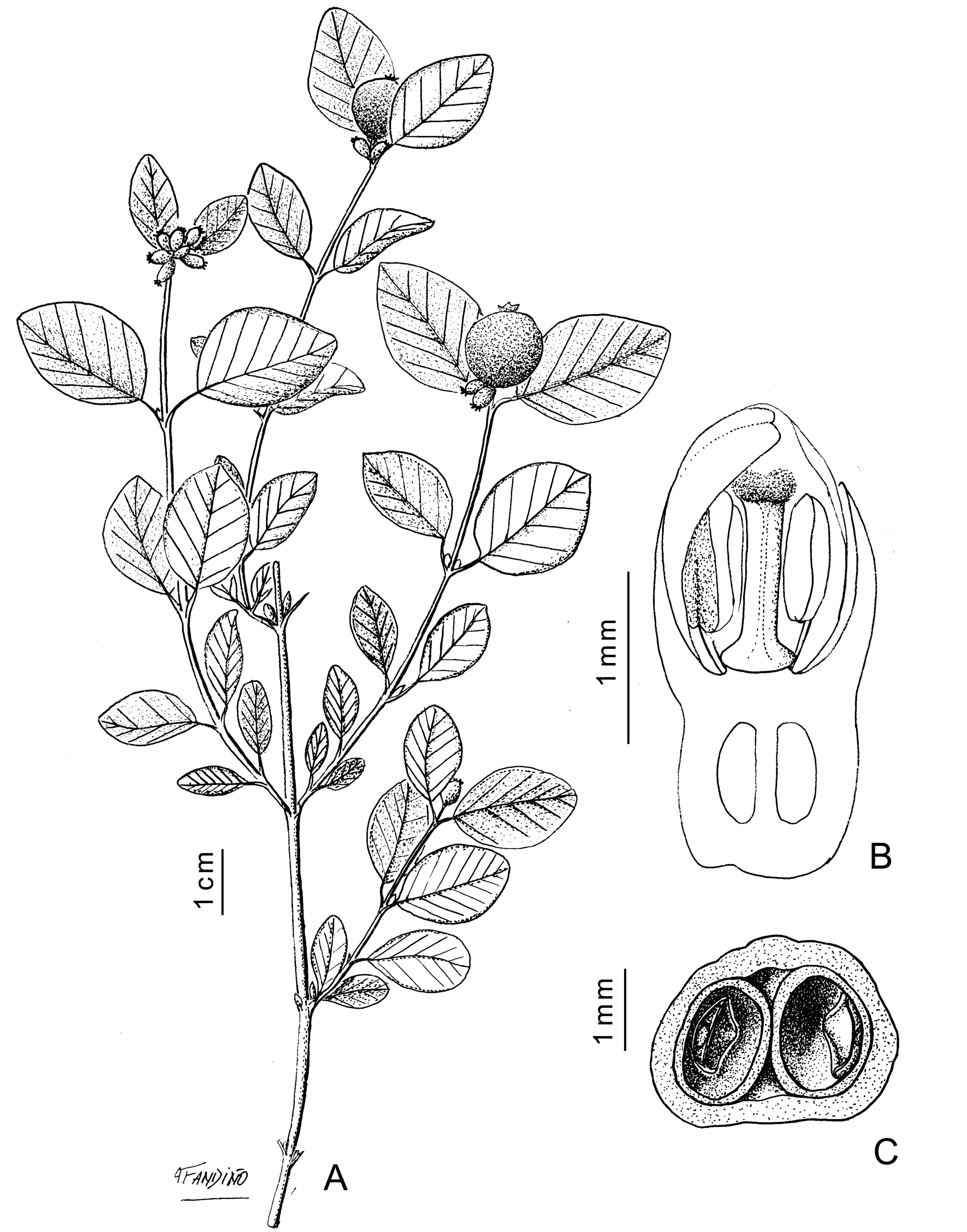 A. Rama fructífera. B. Flor perfecta, corte longitudinal. C. Fruto, corte transversal.