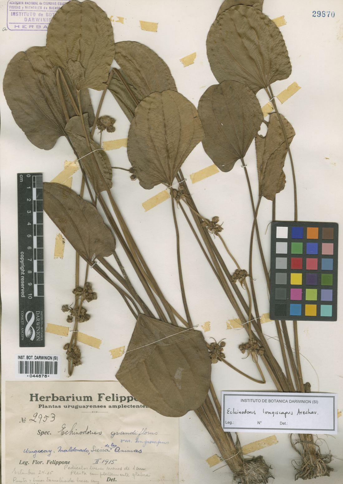Material Tipo: Uruguay. "Estos dos Echinodorus proceden del arroyo Cardoso". "Echinodorus longiscapus. Escapo y hoja" en Arechavaleta, Anales Mus. Nac. Montevideo 4(1): lam. 2. 1903 (lectotipo designado por Haynes & Holmes-Nielsen, Fl. Neotrop. 64: 45. 1994).