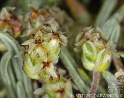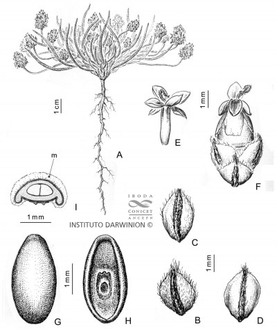 Hierbas anuales, bienales o hasta de 3 años, hasta de 0,15 m de alto; raíz primaria profunda, fusiforme, engrosada, hasta de 15 cm de largo con raíces secundarias filiformes; cáudex corto, grueso, de 5-15 mm de largo. Hojas arrosetadas, alternas; láminas lineares, de 1,5-10 × 0,05-0,1 cm, ápice agudo, base subvaginante, margen entero, densamente seríceo-pubescentes, raramente glabras. Espigas ovoides o globosas, multifloras o bien paucifloras, de 5-15 mm de largo; escapos ascendentes, de 1,4- 14,5 cm de largo, densamente seríceo-pubescentes. Flores en la axila de una bráctea triangular-ovada, de 2-3 mm de largo; cáliz con sépalos connados sólo en la base, lóbulos de 2,6-3,2 mm de largo; corola con el tubo glabro, lóbulos de 1,3-3,3 mm de largo. Pixidio 1-seminado, elipsoide, de 4,5-5,2 mm de largo. Semillas elipsoides, de 1,9-2,7 mm de largo.