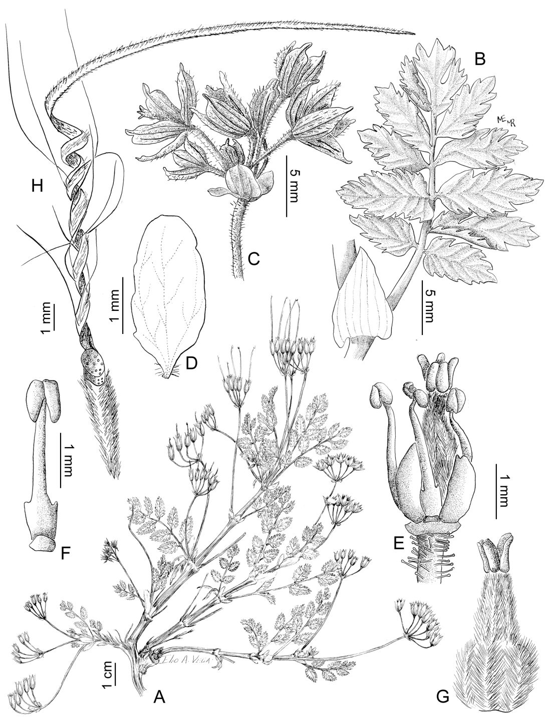 A. Planta. B. Hoja. C. Inflorescencia. D. Pétalo. E. Androceo y gineceo. F. Estambre. G. Gineceo. H. Mericarpo.
