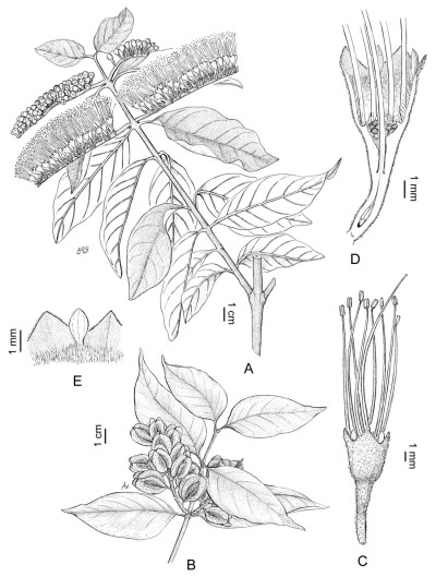 Liana o arbusto trepador, apoyante, de 3-8 m de alto; ramas 4-angulares cubiertas de tricomas combretáceos y lepidotos, castaño-dorados en las diferentes estructuras. Hojas con pecíolo de 3-9 mm de largo, glabro a pubescente, densamente cubierto de tricomas lepidotos; láminas ovadas a elípticas, de 7-13 × 3-6,5 cm, márgenes revolutos especialmente hacia la base, ápice acuminado, agudo u obtuso, base cuneada, redondeada o subcordada, cartáceas o subcoriáceas, generalmente glabras o densamente cubiertas de tricomas lepidotos en la cara abaxial y esparcidos en la cara adaxial, discoloras; domacios ausentes. Inflorescencias en espigas densifloras, axilares, en pares opuestos, de 5-15 cm de largo, la terminal rara vez presente, en general atrofiada o caduca, glabras a densamente cubiertas de tricomas lepidotos. Flores de 20-35 mm de largo (incluyendo los estambres), dispuestas alrededor del raquis, pero en la antesis curvadas hacia arriba ocupando un solo lado del raquis, verdosas, a la madurez amarillo-anaranjadas; brácteas subuladas de 1,5-3,5 cm de largo, caducas, cubiertas de tricomas lepidotos; hipanto cubierto de tricomas lepidotos; sépalos 4, lóbulos deltoideos de 1-2 mm de largo, erectos, ápice agudo a subagudo, a veces obtuso y apiculado, cubiertos densamente de tricomas lepidotos; pétalos 4, elípticos a suborbiculares, de 1,5-3 × 0,8-2, glabros, ápice obtuso a agudo, apiculado a cortamente acuminado; estambres 8, exertos, filamentos de 10-20 mm de largo, glabros o con tricomas rojizo-anaranjados y cubiertos de tricomas lepidotos, anteras de 1-1,2 mm de largo; disco nectarífero de borde piloso; ovario ca. 3 × 1 mm; estilo exerto, de 13-30 mm de largo, glabro. Fruto de contorno oblongo-elíptico a elíptico, de 12-25 × 10-15(-20) mm, rojizo y densamente cubierto con tricomas lepidotos, especialmente en el cuerpo, ápice obtuso a redondeado o con un apículo, base redondeada a truncada, alas 4. Semilla fusiforme, 4-gona, ca. 12 mm de largo, con el tegumento rugoso.